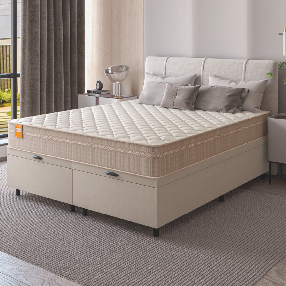 Cama Box Baú Casal Queen Colchão Molas Qatar 158x198x63cm Bege/Branco Inducol - Suporta Até 200 Kg Pessoa