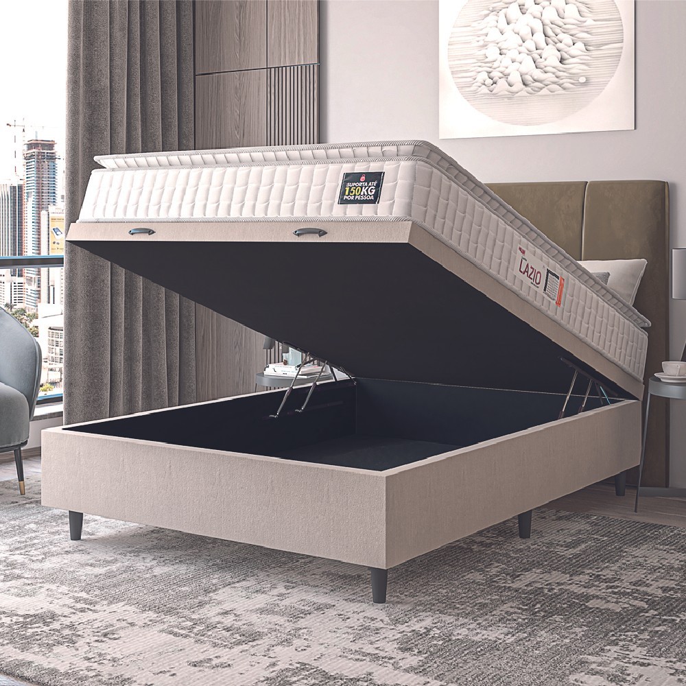 Cama Box Baú Colchão Casal Espuma D45 Lazio Pillow Top 138x188x70cm Branco / Bege Hellen