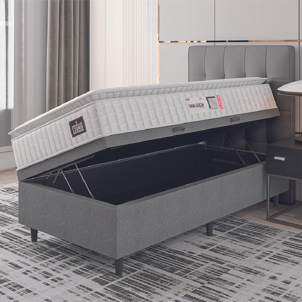 Cama Box Baú Colchão Solteiro Espuma D33 Vangogh Pillow Top 88x188x70cm Branco / Cinza Hellen
