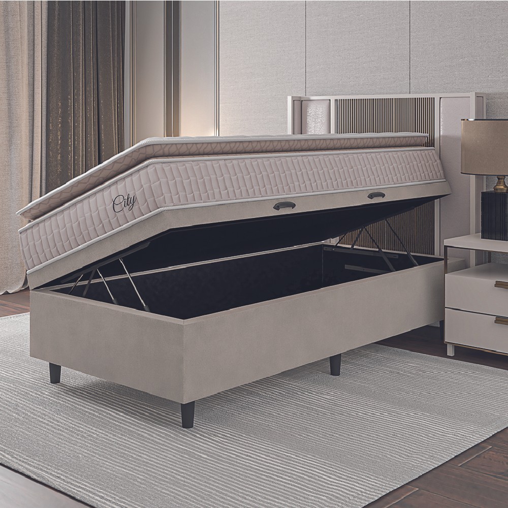 Cama Box Baú Colchão Solteiro Molas Ensacadas City Pillow Top 88x188x64cm Branco / Bege Hellen