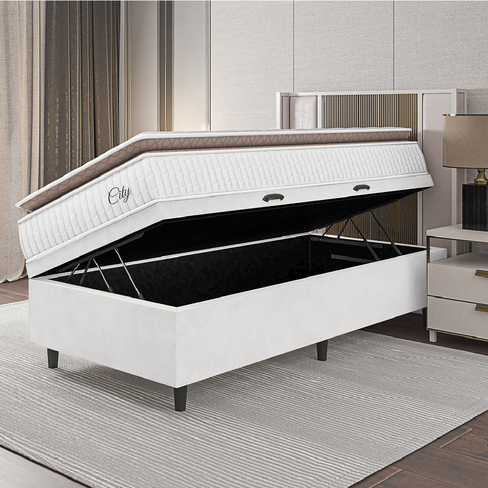 Cama Box Baú Colchão Solteiro Molas Ensacadas City Pillow Top 88x188x64cm Linho Branco / Bege Hellen
