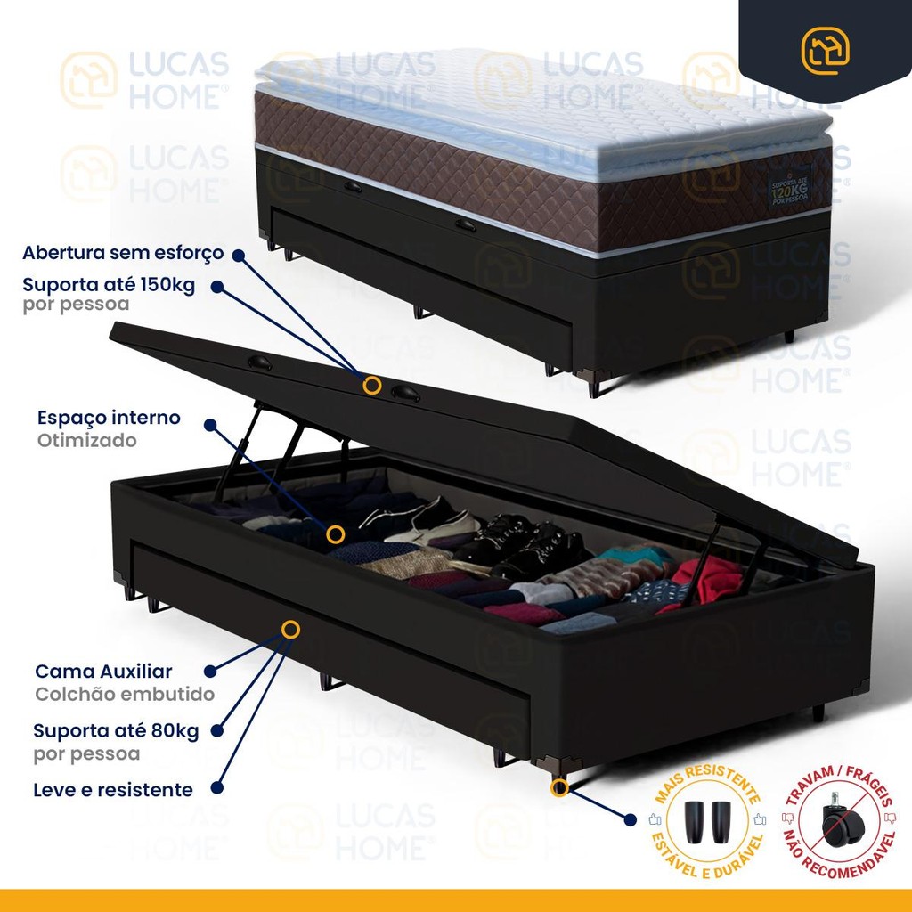 Se você valoriza conforto e suporte em seu descanso, nosso colchão com espuma D33 e pillow top é a solução ideal. A densidade D33 oferece um suporte firme que é aprimorado pela camada extra de conforto proporcionada pelo pillow top, tornando cada noite de sono uma experiência luxuosa. Este design cuidadosamente pensado combina firmeza com uma suavidade acolhedora, adequado para quem busca aliviar pontos de pressão enquanto dorme. O pillow top adiciona uma camada plush ao colchão, ideal para quem precisa de um pouco mais de maciez sem comprometer o suporte ortopédico. Com capacidade para suportar até 120Kg por pessoa, este colchão é robusto e durável, garantindo que você desfrute de um investimento em descanso de longa duração. Cada detalhe é projetado para melhorar sua saúde e conforto noturno. A Base Baú com Auxiliar da Lucas Colchões combina praticidade e durabilidade. A cama auxiliar embutida é uma solução inteligente para otimizar espaço, ideal para visitas ou famílias grandes. Fácil de manusear, pode ser utilizada sempre que necessário e guardada discretamente, mantendo o ambiente organizado. O baú com um super espaço interno, ideal para guardar roupas de cama, edredons, travesseiros, mantas, toalhas e etc. É perfeita para quem busca otimizar espaço sem abrir mão da qualidade e resistência. Especificações Técnicas Colchão: - Proteções: Antiácaro, Antialérgico, Antifungo, Antimofo; - Revestimento Tampo: Bordado; - Densidade: Espuma D33; - Sistema One Face; - Pillow Top: Possuí (Camada extra de conforto); - EPS Poliestireno Expansível(Suporte adicional): Possui; - Tipo de conforto: Firme; - Peso máximo recomendado: até 120Kg (por pessoa); - Garantia: 12 meses; - Dimensões do produto (larg. x comp. x alt.) 88x188x19cm. Especificações Técnicas da Base Baú com Auxiliar: - Marca: Lucas Colchões; - Material: Madeira tratada; - Peso máximo recomendado: até 150Kg (por pessoa); - Altura do baú: 37cm; - Cama Auxiliar: Espuma D20; - Altura dos pés: 5cm; - Revestimento: Material Sintético; - Garantia: 6 meses; - Dimensões do produto (larg. x comp. x alt.) Solteiro: 88x188x42cm Importante: As cores podem variar conforme a tela; Não oferecemos montagem; recomendamos profissionais qualificados. Confira as dimensões para transporte em elevadores e passagens. Não transportamos por meios especiais. Devoluções de produtos íntimos só com embalagem intacta.