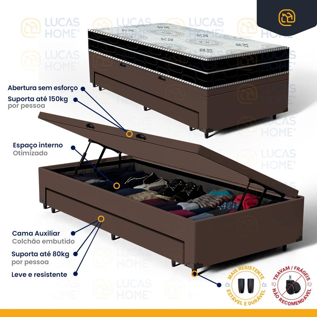 Procura um colchão que ofereça suporte excepcional sem comprometer o conforto? O OrtoConfort da Anjos, exclusivo da Lucas Home, é construído com espuma D45 de alta densidade, ortopédico proporcionando um tipo de conforto firme ideal para quem necessita de suporte adicional para a coluna. E mais, o OrtoConfort vem com um Pillow In, uma camada extra de conforto embutida. suportando até 140kg por pessoa. OrtoConfort é a escolha ideal para quem busca um descanso reparador com benefícios ergonômicos e higiênicos avançados. A Base Baú com Auxiliar da Lucas Colchões combina praticidade e durabilidade. A cama auxiliar embutida é uma solução inteligente para otimizar espaço, ideal para visitas ou famílias grandes. Fácil de manusear, pode ser utilizada sempre que necessário e guardada discretamente, mantendo o ambiente organizado. O baú com um super espaço interno, ideal para guardar roupas de cama, edredons, travesseiros, mantas, toalhas e etc. É perfeita para quem busca otimizar espaço sem abrir mão da qualidade e resistência. Especificações Técnicas Colchão: - Modelo: Exclusivo Lucas Home; - Marca: Anjos; - Possui Pillow: Pillow In (Camada extra de conforto); - Matéria prima: Espuma D45; - Tipo de conforto: Firme; - Garantia: 12 Meses; - Proteções: Antiácaro - Antialérgico - Antifungo - Antimofo; - EPS Poliestireno Expansível (camada de suporte adicional): Possui; - Peso máximo recomendado: até 140Kg (por pessoa); - Dimensões do produto (larg. x comp. x alt.) 88x188x18cm. Especificações Técnicas da Base Baú com Auxiliar: - Marca: Lucas Colchões; - Material: Madeira tratada; - Peso máximo recomendado: até 150Kg (por pessoa); - Altura do baú: 37cm; - Altura dos pés: 5cm; - Cama Auxiliar: Espuma D20; - Revestimento: Material Sintético; - Garantia: 6 meses; - Dimensões do produto (larg. x comp. x alt.) Solteiro: 88x188x42cm Importante: As cores podem variar conforme a tela; Não oferecemos montagem; recomendamos profissionais qualificados. Confira as dimensões para transporte em elevadores e passagens. Não transportamos por meios especiais. Devoluções de produtos íntimos só com embalagem intacta.