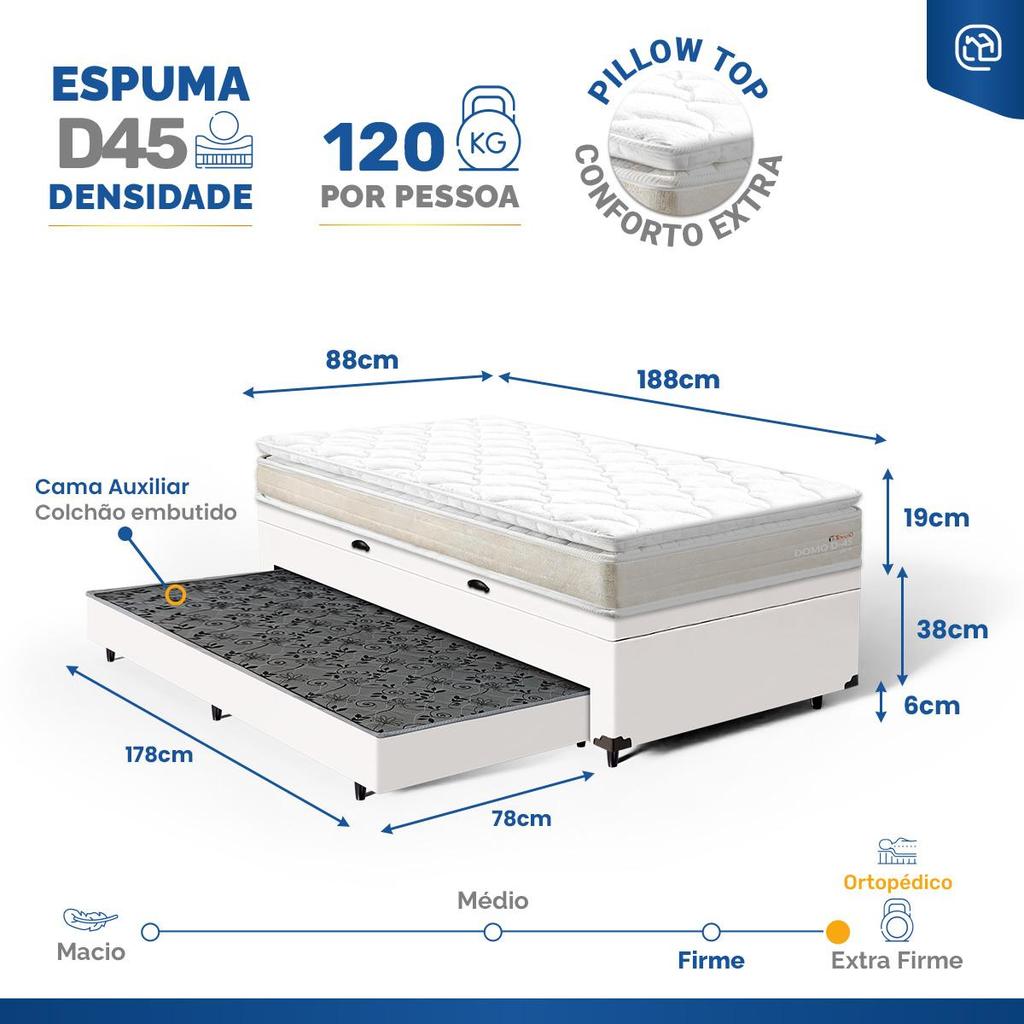 Cama Box Baú com Colchão de Espuma D45 Pillow Top Ortopédico Domo + Auxiliar Solteiro 88cm