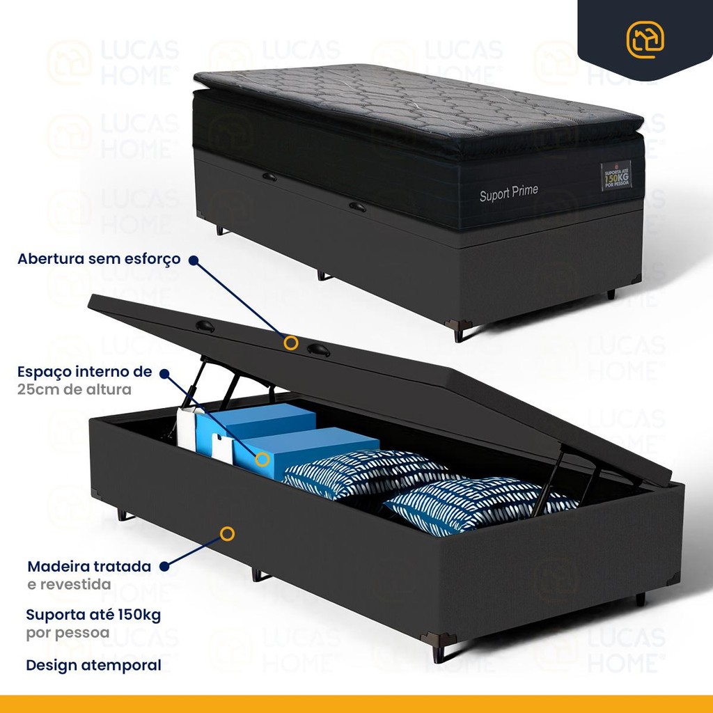 Cama Box Baú com Colchão de Espuma D45 Pillow Top Suport Prime Solteiro 88cm