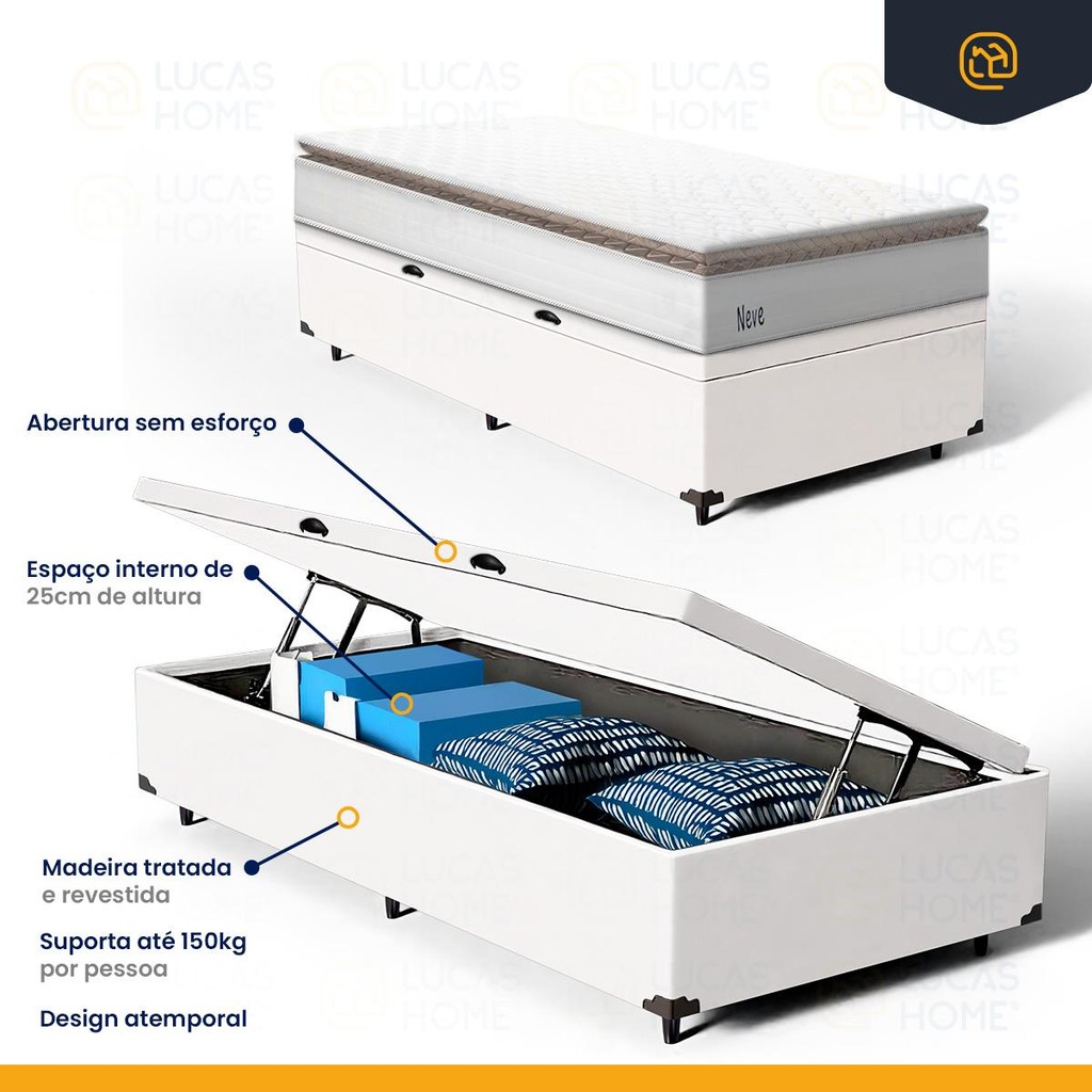 Cama Box Baú com Colchão de Molas Ensacadas Pillow Top Neve Solteiro 88cm