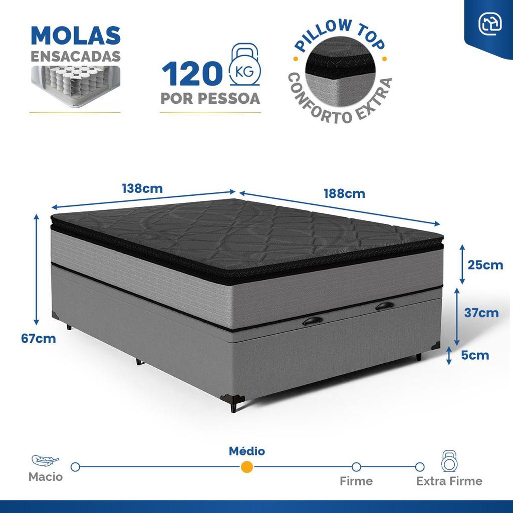 Cama Box Baú com Colchão de Molas Ensacadas Pillow Top UmaFlex Vitta Casal 138cm