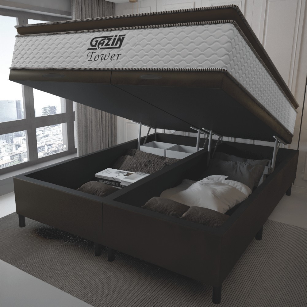 Cama Box Baú King Gazin Colchão Molas Ensacadas Com Pillow Top Tower 193x203x75cm Branco/Marrom