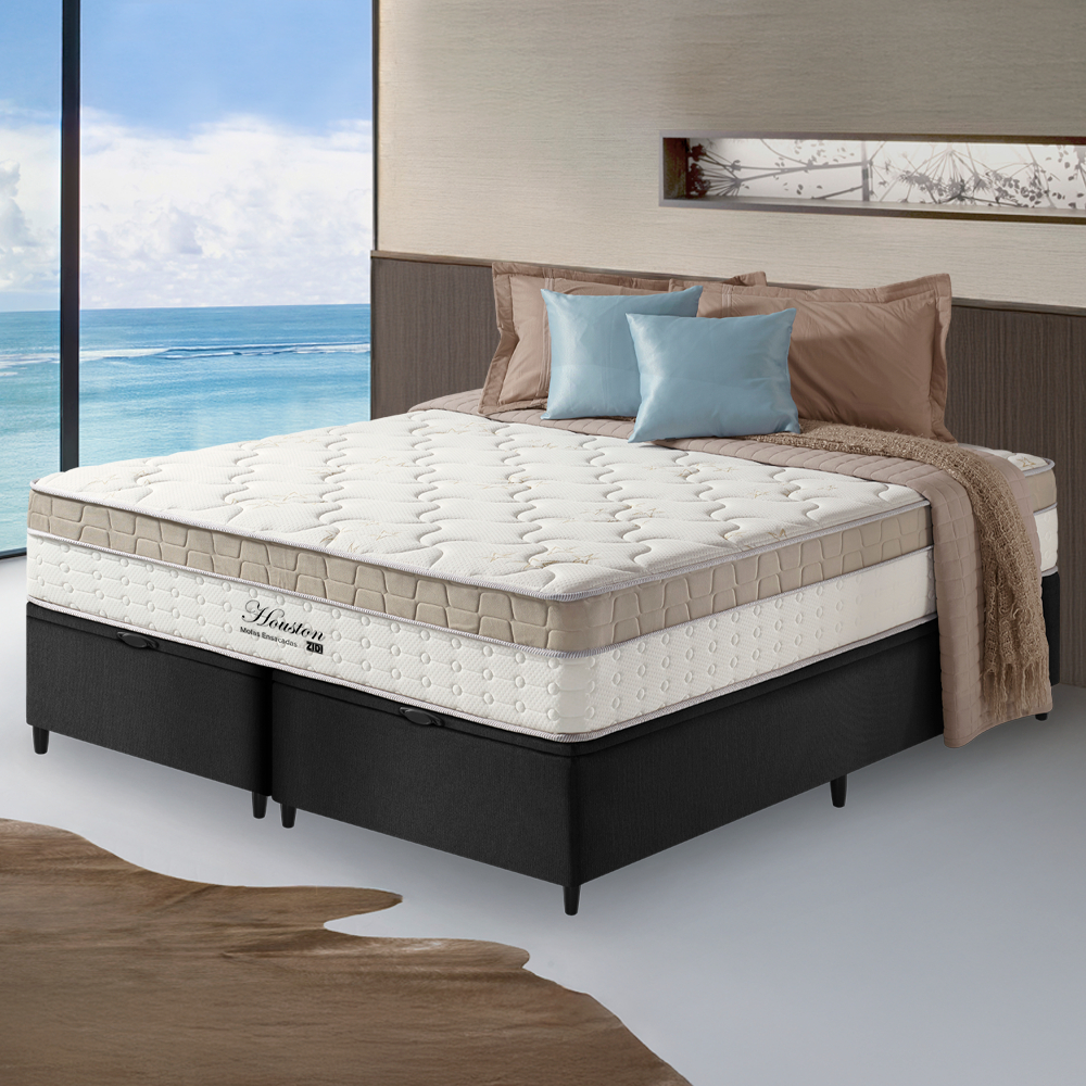 Cama Box Baú Queen Preto + Colchão Molas Ensacadas Houston Pillow Inn 158x198x70cm