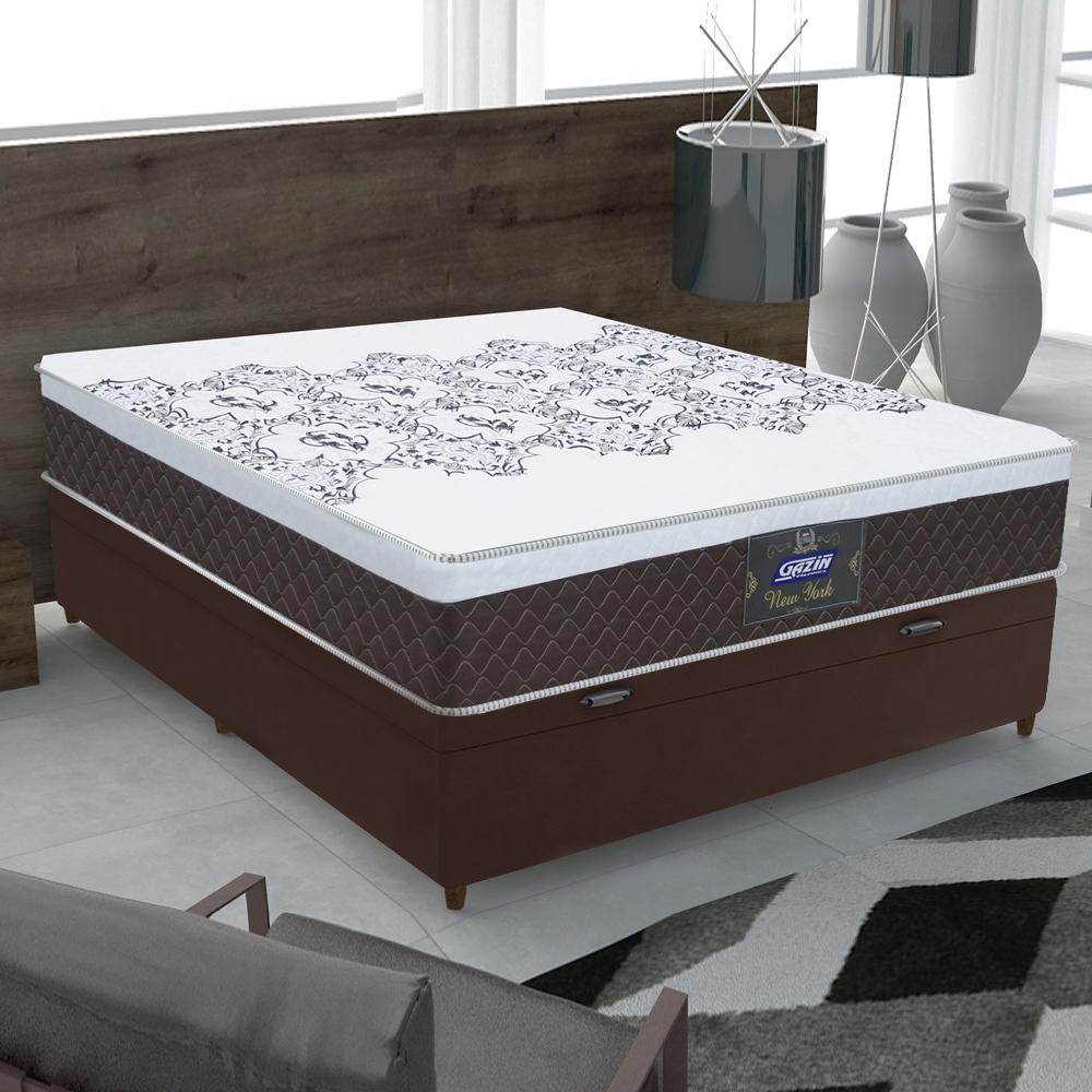 Cama Box Casal Baú Colchão Molas Ensacadas com Euro IN New York Marrom / Branco 138x188x67cm