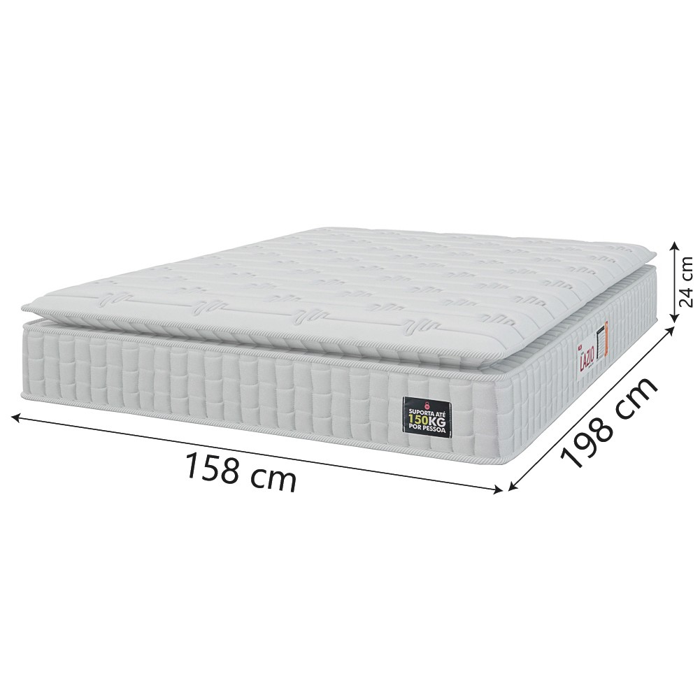 Você merece o melhor quando se trata de qualidade e bem-estar, e por isso o Colchão de Casal Queen Lazio e o Box Prince se tornam a escolha certa! O Colchão possui espuma de alta qualidade em sua composição, trazendo conforto e durabilidade, além de ser um produto firme e resistente. Conta com Pillow Top, ou seja, uma camada extra de espuma de densidade D45 com revestimento em poliéster na parte superior, possibilitando mais maciez e suavidade ao toque, e suporta até 150 kg por pessoa. O Box é feito de tecido reforçado e nobre, é excelente para você que busca um produto moderno e prático. Possui estrutura resistente, um belo acabamento, é um produto de fácil limpeza. MEDIDAS DO COLCHÃO: A = 24 cm L = 158 cm P = 198 cm MEDIDAS DO BOX: A = 38 cm / 26 cm (sem pés) L = 158 cm P = 198 cm ALTURA DOS PÉS: 12 cm PESO: 67,46 kg PESO SUPORTADO: 150 kg por pessoa MODELO: Cama Box Casal Queen Colchão Espuma D45 Lazio Pillow Top 158x198x62cm Suporta Até 150 Kg Por Pessoa MARCA COLCHÃO: Hellen MARCA BOX: Prince COR: Branco REVESTIMENTO SUPERIOR E LATERAL: Tecido em Jacquard Branco que permite melhor ventilação, proporcionando conforto e sensação agradável ao toque. REVESTIMENTO INTERIOR: Espuma D45 aliada com EPS, que permitem que o colchão suporte até 150 kg por pessoa, oferecendo conforto e estabilidade durante o sono. REVESTIMENTO INFERIOR: Tecido antiderrapante POSSUI EPS: Sim ESPUMA: D45 TECIDO BOX: Linho MATERIAL DA ESTRUTURA DO BOX: Madeira de reflorestamento PÉS: 6 MATERIAL DOS PÉS: PVC OBSERVAÇÃO: Box desmontável ITENS INCLUSOS: 1 Colchão de 1,58m e 1 box desmontável de 1,58m INSTRUÇÕES / CUIDADOS: Utilizar em local seco com passagem de ar, não dobrar, fazer giro quinzenalmente no sentido pés/cabeceira GARANTIA COLCHÃO: 12 Meses GARANTIA BOX: 3 Meses A Esplanada Móveis se responsabiliza pela entrega dos produtos adquiridos até a porta de entrada ou portaria do endereço indicado, se a portaria do condomínio permitir, as entregas são efetuadas no piso térreo e é de responsabilidade do cliente a locomoção da mercadoria até seu apartamento ou casa. Confira as dimensões do produto e certifique-se de que estão adequadas aos elevadores, portas e corredores do local da entrega. Não fazemos a montagem, desmontagem do produto e/ou portas e janelas, locomoção pela escada ou içamento pelo lado de fora do prédio. Não está incluso na entrega o deslocamento até o interior do apartamento, com ou sem elevador, ou deslocamento em locais de difícil acesso como escadarias. Caso o cliente necessite de entrega dentro das dificuldades mencionadas, deverá entrar em contato para análise e dúvidas. Certifique-se de tudo antes de finalizar a compra, evitando assim futuros desagrados ou imprevistos com a entrega.