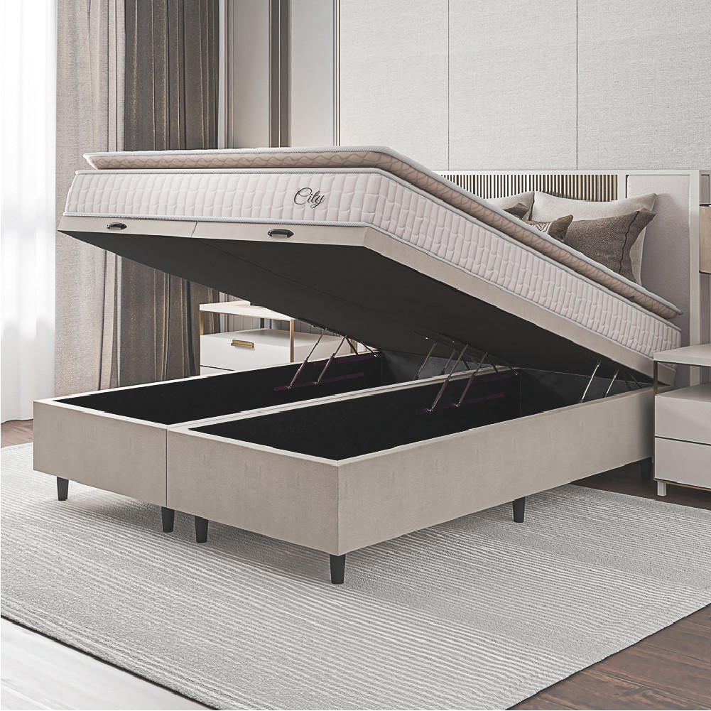 Cama Box Colchão Baú Casal King Molas Ensacadas City Pillow Top 193x203x64cm Bege / Branco Hellen