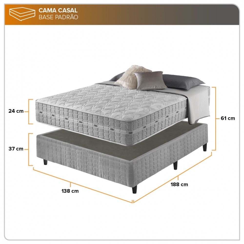 Colchão Casal Molas Ensacadas Alabama 138x188x24cm As molas ensacadas são responsáveis por garantir uma excelente noite de sono. Trata-se de um sistema que opera de maneira individual, sendo independentes umas das outras assegurando assim a longevidade da vida útil do colchão, já que quando alguém se deita, os movimentos ondulatórios são minimamente percebidos, proporcionando um conforto significativo durante o sono. DETALHES EXTERNOS DO COLCHÃO Tipo de Pillow Pillow Flat - Superfície plana, dando um visual mais clean ao colchão. Tipo de Bordado do Tampo Bordado Matelassê: Este método confere volume ao tecido, ampliando a sensação de suavidade e conferindo ao colchão um visual esteticamente agradável. Além de embelezar, ele contribui para uma noite de sono aconchegante e confortável, garantindo bem-estar e uma notável maciez. Tipo do Tecido do Tampo e da Lateral Poliéster - O Poliéster possui vantagens significativas, tais como a grande facilidade para dissipar a umidade e garantir que o colchão seja mais confortável para o sono. É um tecido com alto teor de elasticidade, seu entrelaçamento dá ao produto excelente resistência, beleza e vistosidade, é também um tecido que mantém suas propriedades por mais tempo, não amassa e não perde seu brilho natural. Tratamento dos tecidos Possui um tratamento especial contra ácaros e outras bactérias, prevenindo e evitando crises alérgicas causadas por ácaros presentes na poeira doméstica. No Turn ou No Side O sistema No Turn ou No Side elimina a preocupação de virar seu colchão com frequência. DETALHES INTERNOS DO COLCHÃO Tipo de Estrutura Molas Ensacadas - Produzidas em formato barril, são pré comprimidas e confeccionadas em fio de aço com alto teor de carbono e espessura 2.0. Camadas de Espuma Espuma Densidade D26 - A densidade é a quantidade de matéria-prima utilizada para se fazer um colchão. Quanto maior a densidade, maior o suporte que esse colchão terá a pesos mais elevados. Tipo de Base PR - Uma chapa laminada (especial) de poliestireno com função de fornecer suporte base de apoio para sustentar o colchão. Outras Características Internas Polyframe - Sistema usado nos colchões de molas, composto por um quadro que envolve com borda de espuma de alto suporte (D26) em toda a lateral do colchão. + Suporte de peso ideal de até 120 kg por pessoa. + Possui o nível intermediário de conforto. + Produto aprovado pelo Inmetro com certificação de alta qualidade dentro dos padrões para exportação. + Produto ecológico é todo aquele que seja não poluente, não tóxico, notadamente benéfico ao meio ambiente e a saúde, contribuindo para o desenvolvimento de um modelo econômico e social sustentável. + Até 1 (um) ano de garantia, oferecida pelo fabricante. + Produto de excelente qualidade e excelente acabamento, produto com muita presença, com conforto intermediário, possui também tecido de boa qualidade em seu tampo, em resumo um produto de ótima qualidade por todo o seu composto e por seu excelente custo-benefício. + Em nossa qualificação com nota de 1 a 10, qualificamos este produto com nota 8. Dimensões Altura: 24 cm Largura: 138 cm Profundidade: 188 cm Peso: 20,200 kg Base Cama Box Casal 138x188x37cm Um colchão precisa de um ótimo box para ficar seguro e estável, que seja forte e bonito e é isso que nosso box oferece. O box é produzido com madeira de Eucalipto para garantir uma estrutura firme e resistente. O acabamento em poliéster dá um toque sofisticado e moderno à base, facilitando também a limpeza dela. Para proporcionar ainda mais estabilidade, os pés são de plástico. Características do Box: Estrutura Interna em Madeira de Eucalipto 100% de Reflorestamento Estrutura Externa Em Poliéster Pés em Plástico de 12 cm Tratamento Antiácaro e Antialérgico Possui Tecido Antiderrapante Suporte de até 120 Kg por Pessoa Necessita Montagem dos Pés. Garantia do Fornecedor: 12 Meses Dimensões Altura: 37 cm Largura: 138 cm Profundidade: 188 cm Peso: 21,350 kg Produto não acompanha acessórios decorativos. Imagens meramente ilustrativas. O produto pode ter pequenas variações de cores a depender da tela de visualização. Em caso de devolução, o produto deve ser devolvido em sua embalagem original e sem sinais de uso. A entrega do produto é realizada por transportadora, não subimos escadas ou elevadores com o produto. Não inclui serviço de montagem.
