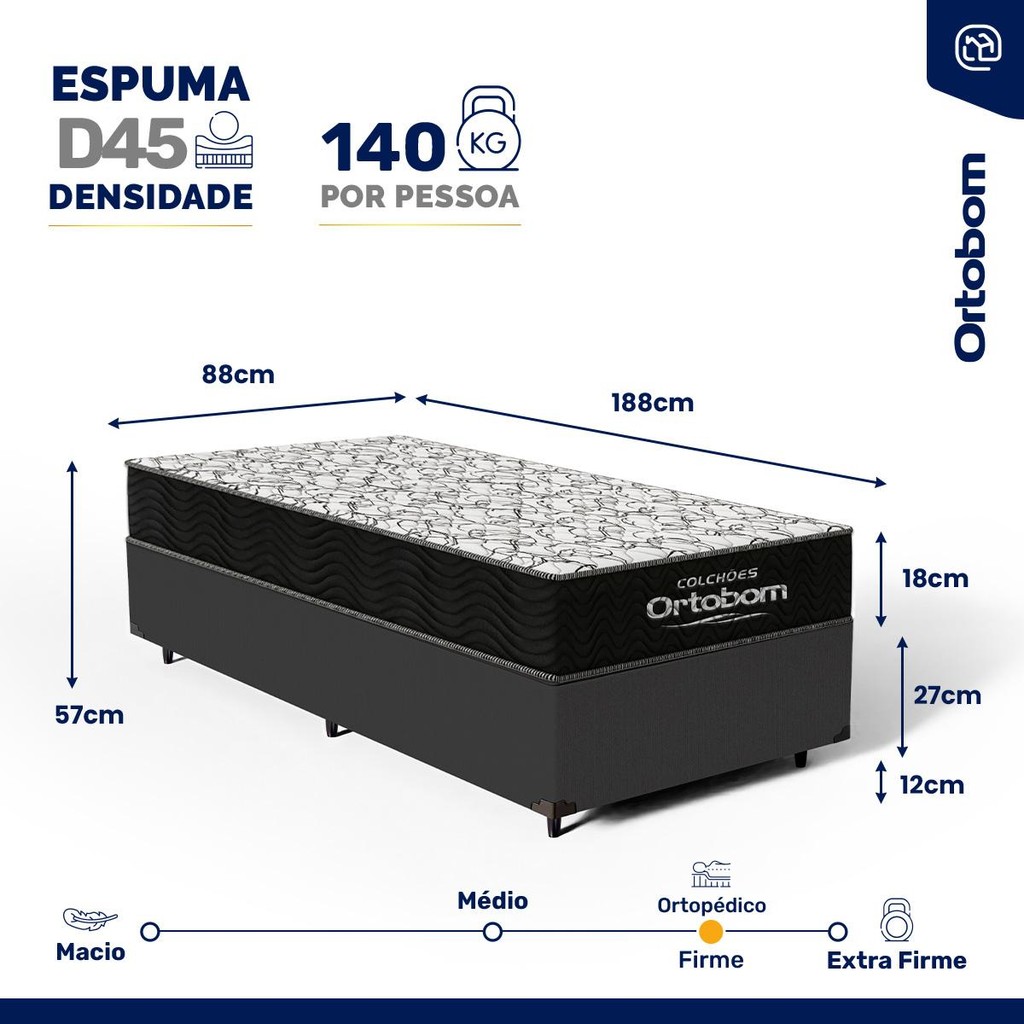 Procura um colchão que ofereça suporte firme e duradouro? Nosso colchão de espuma D45 é ideal, suportando até 140 kg por pessoa. A espuma de alta densidade proporciona conforto firme, mantendo a coluna alinhada durante o sono. O colchão misto com a tecnologia do EPS oferece estabilidade estrutural para o seu colchão, proporcionando uma melhor sustentação para a camada de conforto em espuma, oferecendo noites de descanso mais tranquilas. Ortoluc: Uma linha exclusiva da Ortobom e Lucas Home, proporcionando uma experiência de sono única. Complementando este colchão, a base box é feita de madeira tratada e revestida, suportando até 150 Kg por pessoa. Ela não só eleva seu colchão a uma altura ideal para fácil acesso, mas também estabiliza seu sono com uma fundação sólida e confiável. Esta combinação não apenas maximiza seu conforto, mas também a funcionalidade do seu espaço de descanso. Especificações Técnicas do Colchão: - Proteções: Antiácaro, Antialérgico, Antifungo, Antimofo; - Revestimento: Em malha (Conforto térmico); - Tipo: Espuma D45; - Sistema One Face: Tecnologia No Turn (permite girar o colchão); - EPS Poliestireno Expansível(Suporte adicional): Possui; - Tipo de conforto: Firme(Ortopédico); - Peso máximo recomendado: até 140Kg (por pessoa); - Garantia: 12 meses; - Dimensões (larg. x comp. x alt.) 88x188x18cm. Especificações Técnicas Base Box: - Marca: Lucas Colchões; - Material: Madeira tratada; - Peso máximo recomendado: até 150 Kg (por pessoa); - Altura da base: 27cm; - Altura dos pés: 12cm; - Revestimento: Tecido Sintético; - Garantia: 3 meses; - Dimensões (larg. x comp. x alt.) Solteiro: 88x188x39cm; Importante: as cores podem variar conforme a tela; não oferecemos montagem; recomendamos profissionais qualificados. Confira as dimensões para transporte em elevadores e passagens. Não transportamos por meios especiais. Por se tratar de um produto de uso íntimo e pessoal, só aceitaremos devoluções por arrependimento apenas se a embalagem do produto não for violada.