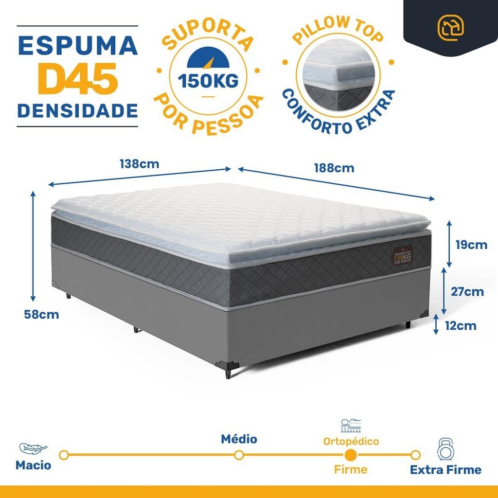 Se busca um colchão que ofereça um descanso profundamente reparador e confortável, nosso modelo com espuma D45 e Pillow Top é a escolha perfeita. Este colchão é ideal para quem prefere um suporte firme, mas com a suavidade adicional proporcionada pelo Pillow Top, garantindo uma superfície acolhedora para aliviar pontos de pressão e melhorar a qualidade do sono. Com capacidade para suportar até 150 kg por pessoa, este colchão é projetado para oferecer durabilidade e robustez, adequando-se perfeitamente a uma ampla gama de preferências de sono. O revestimento bordado adiciona uma camada de elegância e conforto extra, tornando cada noite uma experiência de luxo em seu próprio santuário de descanso. Complementando este colchão, a base box é feita de madeira tratada e revestida, suportando até 150 Kg por pessoa. Ela não só eleva seu colchão a uma altura ideal para fácil acesso, mas também estabiliza seu sono com uma fundação sólida e confiável. Esta combinação não apenas maximiza seu conforto, mas também a funcionalidade do seu espaço de descanso. Especificações Técnicas do Colchão: - Proteções: Antiácaro, Antialérgico, Antifungo, Antimofo; - Revestimento Tampo: Bordado; - Densidade: Espuma D45; - Sistema One Face: Tecnologia No Turn(permite girar o colchão); - Pillow Top: Possuí (Camada extra de conforto); - EPS Poliestireno Expansível(Suporte adicional): Possui; - Tipo de conforto: Firme (Ortopédico); - Peso máximo recomendado: até 150kg (por pessoa); - Garantia: 12 meses; - Dimensões do produto (larg. x comp. x alt.) 138x188x19cm. Especificações Técnicas Base Box: - Marca: Lucas Colchões; - Material: Madeira tratada; - Peso máximo recomendado: até 150 Kg (por pessoa); - Altura da base: 27cm; - Altura dos pés: 12cm; - Revestimento: Sintético; - Garantia: 3 meses; - Dimensões (larg. x comp. x alt.) Casal: 138x188x39cm. Importante: as cores podem variar conforme a tela; não oferecemos montagem; recomendamos profissionais qualificados. Confira as dimensões para transporte em elevadores e passagens. Não transportamos por meios especiais. Por se tratar de um produto de uso íntimo e pessoal, só aceitaremos devoluções por arrependimento apenas se a embalagem do produto não for violada.