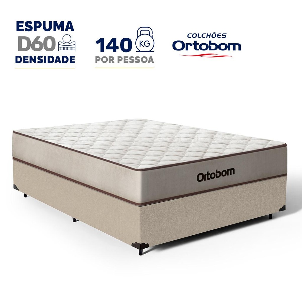 Quer um colchão que ofereça resistência e suporte excepcional? O Colchão Ortobom D60 é a escolha ideal para quem busca robustez e alta durabilidade. Com densidade D60, ele garante alinhamento postural e conforto incomparável. Suportando até 140kg por pessoa, esse colchão é ideal para quem precisa de mais firmeza sem abrir mão do conforto. O sistema Double Face permite que ele seja virado e girado, prolongando sua vida útil e mantendo sempre a melhor performance para suas noites de sono. Complementando este colchão, a base box é feita de madeira tratada e revestida, suportando até 150 Kg por pessoa. Ela não só eleva seu colchão a uma altura ideal para fácil acesso, mas também estabiliza seu sono com uma fundação sólida e confiável. Esta combinação não apenas maximiza seu conforto, mas também a funcionalidade do seu espaço de descanso. Especificações Técnicas do Colchão: - Tipo: Espuma D60; - Proteções: Antiácaro, Antialérgico, Antifungo, Antimofo; - Tampo: Bordado; - Sistema Double Face: Permite virar e girar; - EPS Poliestireno Expansível: Não Possui - 100% espuma; - Tipo de conforto: Médio; - Peso máximo recomendado: até 140kg (por pessoa); - Dimensões (larg. x comp. x alt.) 138x188x20cm. Especificações Técnicas Base Box: - Marca: Lucas Colchões; - Material: Madeira tratada; - Peso máximo recomendado: até 150 Kg (por pessoa); - Altura da base: 27cm; - Altura dos pés: 12cm; - Revestimento: Sintético; - Garantia: 3 meses; - Dimensões (larg. x comp. x alt.) Casal: 138x188x39cm. Importante, as cores podem variar conforme a tela; Não oferecemos montagem; recomendamos profissionais qualificados. Confira as dimensões para transporte em elevadores e passagens. Não transportamos por meios especiais. Por se tratar de um produto de uso íntimo e pessoal, só aceitaremos devoluções por arrependimento apenas se a embalagem do produto não for violada.