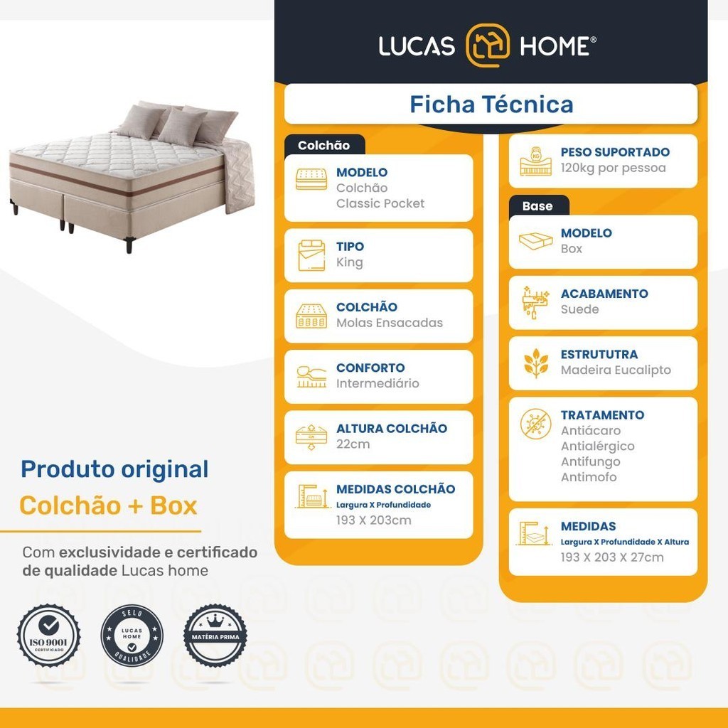 Pensando em melhorar suas noites de sono? O Colchão de Classic Molas Pocket é a escolha ideal! Fabricado com matéria-prima de qualidade, ele suporta até 120kg por pessoa, proporcionando conforto médio, o que lhe confere conforto extra durante o sono sem comprometer sua coluna. Seu revestimento é feito em malha e poliéster garantindo um conforto maior ao seu sono. Procurando uma base de cama que ofereça não só suporte robusto mas também soluções práticas? A base da Lucas Colchões é perfeita para quem precisa de praticidade. Ela não só eleva seu colchão a uma altura ideal para fácil acesso, mas também estabiliza seu sono com uma fundação sólida e confiável. Facilidade de transporte e instalação em locais com acesso limitado, como escadas estreitas e elevadores pequenos. Essa característica torna a base bipartida ideal para apartamentos e casas com espaço de circulação restrito. Especificações Técnicas do Colchão: - Tipo de Mola: Ensacada; - Proteções: Antiácaro - Antialérgico - Antifungo - Antimofo; - Acabamento: Bordado em Matelassê; - Matéria-prima: Espuma/Molas/Tecido; - Tipo de conforto: Macio; - Peso máximo recomendado: até 120kg (por pessoa); - Garantia: 12 meses; - Dimensões do produto (larg. x comp. x alt.) 193x203x22cm. Especificações Técnicas Base Box: - Marca: Lucas Colchões; - Material: Madeira tratada; - Peso máximo recomendado: até 150 Kg (por pessoa); - Altura da base: 27cm; - Altura dos pés: 12cm; - Revestimento: Sintético; - Garantia: 3 meses; - Dimensões (larg. x comp. x alt.) Super King: 193x203x39cm( 2 partes de 96cm ). Importante, as cores podem variar conforme a tela; Não oferecemos montagem; recomendamos profissionais qualificados. Confira as dimensões para transporte em elevadores e passagens. Não transportamos por meios especiais. Por se tratar de um produto de uso íntimo e pessoal, só aceitaremos devoluções por arrependimento apenas se a embalagem do produto não for violada.