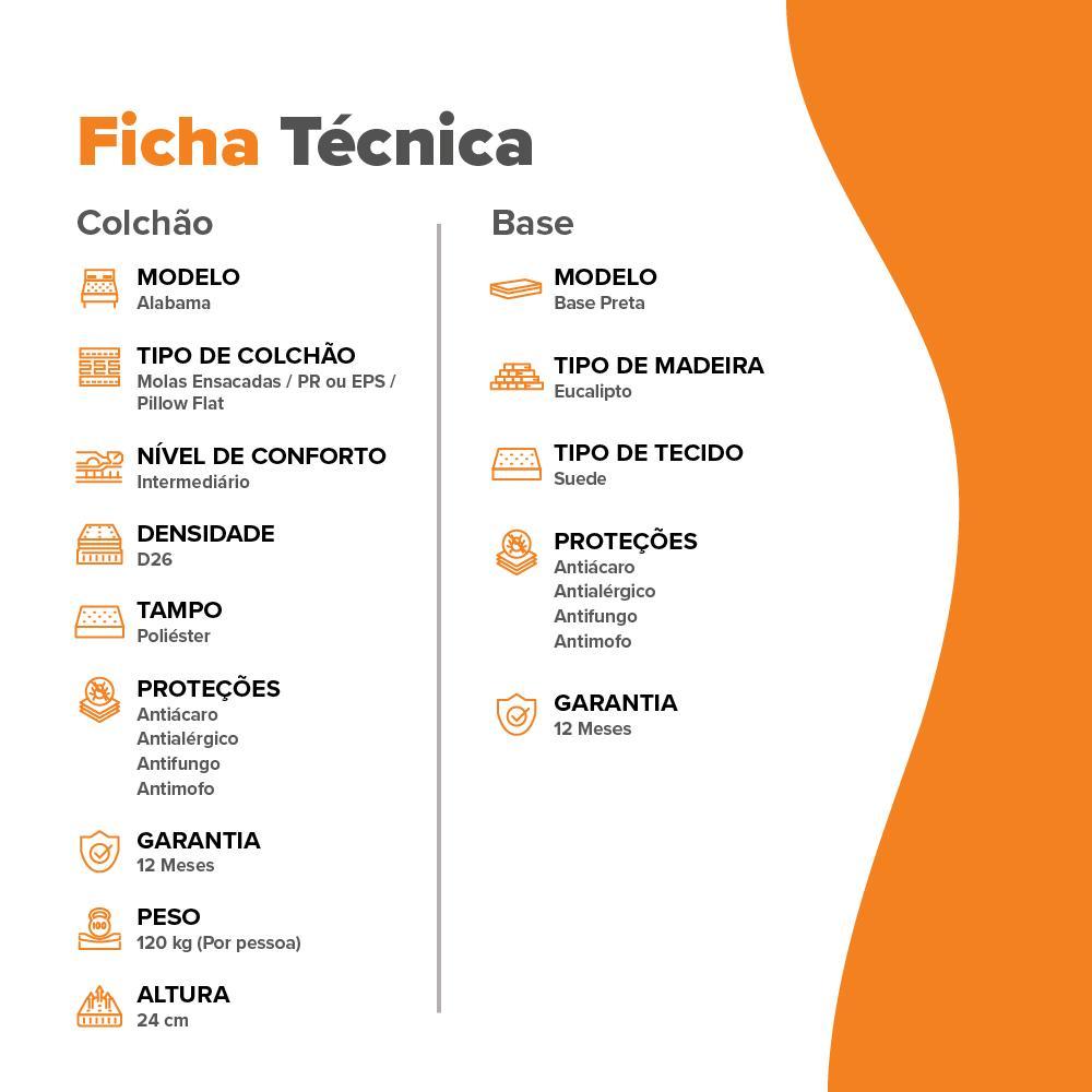 A Cama Box + Colchão Molas Ensacadas Zidi Alabama oferece conforto, estabilidade e durabilidade em um conjunto completo. O colchão possui molas ensacadas que reduzem movimentos, Pillow Flat com maciez equilibrada, bordado matelassê e revestimento em poliéster resistente e fácil de higienizar, com tratamento antialérgico e sistema No Turn. A base em EPS garante suporte firme, enquanto o sistema Polyframe com espuma D26 reforça as bordas. A base box em madeira de eucalipto é resistente, com revestimento em poliéster, pés reforçados e superfície antiderrapante. Suporta até 120 kg por pessoa e oferece conforto intermediário, ideal para quem busca cama box com colchão de molas ensacadas confortável e durável. Características do Colchão: Polyframe: Sistema usado nos colchões de molas, composto por um quadro que envolve com borda de espuma de alto suporte (D26) em toda a lateral do colchão. Suporta até 120 kg por pessoa Conforto intermediário Produto aprovado pelo INMETRO, conforme padrões de qualidade para exportação Garantia de 1 ano pelo fabricante Características da Cama Box: Estrutura em madeira de eucalipto de reflorestamento Revestimento externo em tecido poliéster Pés em plástico com 12 cm de altura Tratamento antiácaro e antialérgico Tecido superior com superfície antiderrapante Suporta até 120 kg por pessoa Necessita montagem dos pés Garantia de 1 ano pelo fabricante Dimensões do Colchão: Altura: 24cm Largura: 193cm Profundidade: 203cm Peso: 31,800 kg Dimensões Cama Box: Altura com os pés: 37cm Largura:193cm Profundidade: 203cm Peso: 32,500 kg Observações Importantes: Produto não acompanha acessórios decorativos. Imagens meramente ilustrativas. As cores do produto podem sofrer pequenas variações conforme o monitor ou tela de visualização. Em caso de devolução, o item deve ser devolvido na embalagem original e sem sinais de uso. Não será feita a entrega em áreas consideradas de risco ou zonas rurais. A entrega é realizada por transportadora. Não realizamos subida por escadas ou elevadores. Não inclui serviço de montagem.