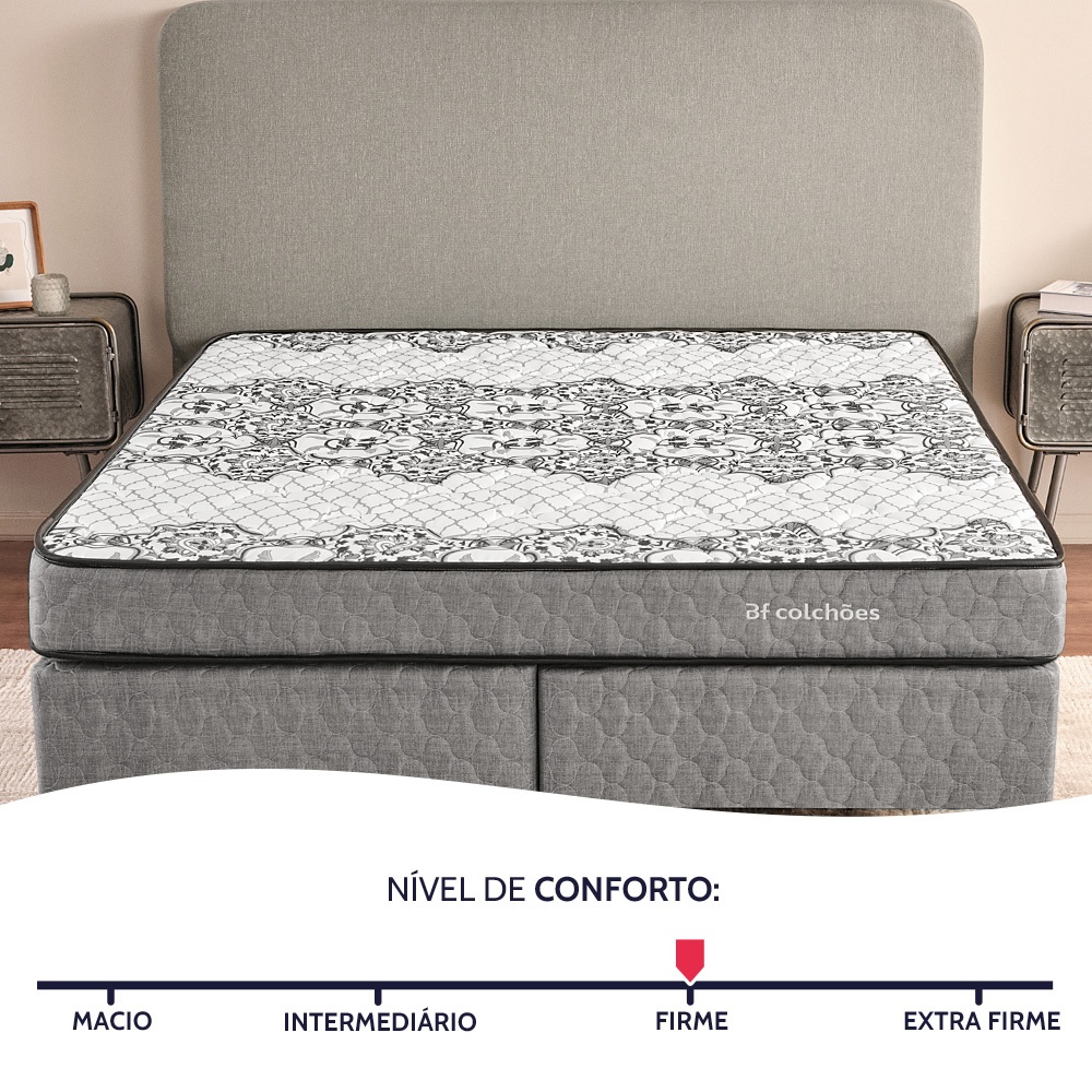 Desenvolvido com espuma de densidade 28, o Colchão Ortopédico Sleep Time, um dos mais vendidos da indústria BF Colchões, oferece suporte firme e ortopédico para o alinhamento da coluna, mas com um toque de conforto para alívio dos pontos de pressão, ideal para quem busca um descanso completo e restaurador a cada noite. Suporte de Peso: Até 120Kg por pessoa Nível de Conforto: Firme Densidade: Espuma D28 Certificada Tecido: Poliéster Bordado em Matelassê Hipoalergênico Firmeza e suporte ortopédico para um descanso saudável Projetado para manter a coluna corretamente alinhada, o Sleep Time conta com espuma Max Flowing D28, que oferece suporte firme, mantém a postura correta, alivia pontos de pressão e previne desconfortos ao acordar. Ideal para quem prioriza bem-estar e saúde da coluna. Durabilidade e suporte superior Com uma estrutura interna composta pela High Support Board, o Sleep Time oferece firmeza e estabilidade duradouras. Esse material mantém a forma do colchão e proporciona o suporte necessário para noites de sono mais saudáveis. Cuidado que combina com a qualidade do seu sono O tecido do colchão passa por um tratamento antimicrobiano, eliminando bactérias, ácaros e outros agentes alérgenos para oferecer um ambiente de sono mais limpo e protegido. É um toque de cuidado que contribui para o seu bem-estar. Características: Tamanho: King (193 cm x 203 cm x 17 cm); Suporte de Peso: Até 120 Kg por pessoa; Nível de Conforto: Firme; Densidade: Espuma D28 certificada; High Support Board: Centro em poliestireno expandido (EPS); Revestimento: Tecido 100% poliéster com tratamento antimicrobiano; Garantia: 1 ano; Marca: BF Colchões. Características do box: Tamanho: King (193 cm x 203 cm x 34 cm); Revestimento: Linho cinza; Estrutura: Madeira de Eucalipto de Reflorestamento; Pés: Rosqueáveis em madeira; Garantia: 03 Meses; Marca: BF Colchões. Certificados de qualidade: ABICOL (Associação Brasileira das Indústrias de Colchões). Qualidade ISO 9001. INMETRO. Quem é a BF Colchões? Para nós, dormir bem é a base de uma vida plena de sonhos e qualidade de vida. Com mais de 55 anos de experiência e mais de 900 colaboradores, somos pioneiros na venda online de colchões, nos tornando a marca mais vendida e bem avaliada da internet, melhorando a qualidade do sono de milhares de brasileiros. Cuidamos de toda a produção — desde a fabricação da espuma até o último detalhe — com design, engenharia e cuidado em cada colchão. Em nosso laboratório próprio, desenvolvemos e testamos todas as nossas espumas para entregar conforto, durabilidade e o melhor custo-benefício do mercado para garantir a satisfação de milhares de clientes em todo o país. Prazer, somos a BF Colchões. Atenção a entrega: Não fazemos entregas em estrada de terra, ou barco. Não subimos produtos por escadas e elevadores.