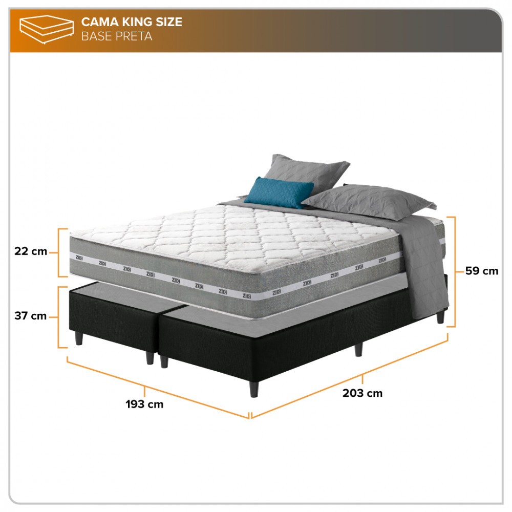 Colchão King Size Molas Ensacadas Miami 193x203x22cm As molas ensacadas são responsáveis por garantir uma excelente noite de sono. Trata-se de um sistema que opera de maneira individual, sendo independentes umas das outras, assegurando assim a longevidade da vida útil do colchão, já que quando alguém se deita, os movimentos ondulatórios são minimamente percebidos, proporcionando um conforto significativo durante o sono. DETALHES DO COLCHÃO Tipo de Pillow: Pillow Flat - Superfície plana, dando um visual mais clean ao colchão. Tipo de Bordado do Tampo: Bordado Matelassê: Este método confere volume ao tecido, ampliando a sensação de suavidade e conferindo ao colchão um visual esteticamente agradável. Além de embelezar, ele contribui para uma noite de sono aconchegante e confortável, garantindo bem-estar e uma notável maciez. Tipo do Tecido do Tampo: Malha - De modo geral, podemos dizer que a malha é uma estrutura criada a partir de uma tecelagem específica, com o ato de entrelaçar os fios em um sentido constante. Isso confere, ao mesmo tempo, flexibilidade e força à peça, tornando-a muito resistente e maleável. Tipo do Tecido da Lateral: Poliéster - O Poliéster possui vantagens significativas, tais como a grande facilidade para dissipar a umidade e garantir que o colchão seja mais confortável para o sono. É um tecido com alto teor de elasticidade, seu entrelaçamento dá ao produto excelente resistência, beleza e vistosidade, é também um tecido que mantém suas propriedades por mais tempo, não amassa e não perde seu brilho natural. Tratamento dos tecidos: Possui um tratamento especial contra ácaros e outras bactérias, prevenindo e evitando crises alérgicas causadas por ácaros presentes na poeira doméstica. No Turn ou No Side: O sistema No Turn ou No Side elimina a preocupação de virar seu colchão com frequência. Tipo de Estrutura: Molas Ensacadas - Produzidas em formato barril, são pré-comprimidas e confeccionadas em fio de aço com alto teor de carbono e espessura 2.0. Camadas de Espuma: Espuma Densidade D28 - A densidade é a quantidade de matéria-prima utilizada para se fazer um colchão. Quanto maior a densidade maior o suporte terá a pesos mais elevados. Moldura Perimetral: Polyframe - Sistema usado nos colchões de molas, composto por um quadro que envolve com borda de espuma de alto suporte (D26) em toda a lateral do colchão. Características: Suporte de peso ideal de até 120 kg por pessoa. Possui o nível intermediário de conforto. Produto aprovado pelo Inmetro com certificação de alta qualidade dentro dos padrões para exportação. Produto ecológico é todo aquele que seja não poluente, não tóxico, notadamente benéfico ao meio ambiente e a saúde, contribuindo para o desenvolvimento de um modelo econômico e social sustentável. Até 1 (um) ano de garantia, oferecida pelo fabricante. Produto de excelente qualidade e excelente acabamento, produto com muita presença, com conforto intermediário, possui também tecido de boa qualidade em seu tampo, em resumo um produto de ótima qualidade por todo o seu composto e por seu excelente custo-benefício. Em nossa qualificação com nota de 1 a 10, qualificamos este produto com nota 8. Dimensões: Altura: 22 cm Largura: 193 cm Profundidade: 203 cm Peso: 31,600 kg Garantia do Fabricante: 12 Meses. Base Cama Box King Size 193x203x37cm Um colchão precisa de um ótimo box para ficar seguro e estável, que seja forte e bonito e é isso que nosso box oferece. O box é produzido com madeira de Eucalipto para garantir uma estrutura firme e resistente. O acabamento em suede dá um toque sofisticado e moderno à base, facilitando também a limpeza dela. Para proporcionar ainda mais estabilidade, os pés são de plástico. Características do Box: Estrutura Interna em Madeira de Eucalipto 100% de Reflorestamento. Estrutura Externa Em Suede Pés em Plástico de 12 cm Tratamento Antiácaro e Antialérgico Possui Tecido Antiderrapante Suporte de até 120 Kg por Pessoa Necessita Montagem dos Pés. Dimensões Altura com os pés: 37 cm Largura: 193 cm Profundidade: 203 cm Peso: 32,500 kg Garantia do Fabricante: 12 Meses Observações: Produto não acompanha acessórios decorativos. Imagens meramente ilustrativas. O produto pode ter pequenas variações de cores a depender da tela de visualização. Em caso de devolução, o produto deve ser devolvido em sua embalagem original e sem sinais de uso. A entrega do produto é realizada por transportadora, não subimos escadas ou elevadores com o produto. Não inclui serviço de montagem.