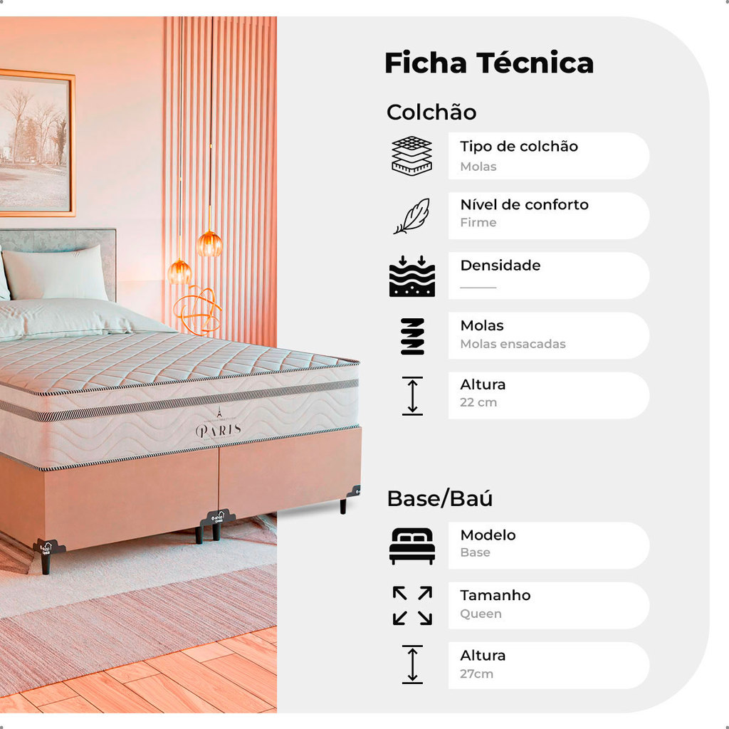 Cama Box Queen Bege + Colchão Paris Molas Ensacadas Branco