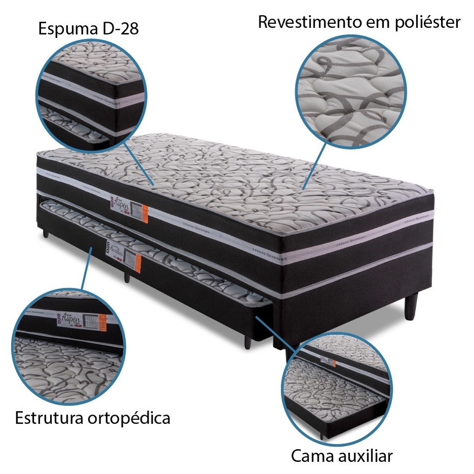 Conjugado ortopédico Aspen da Hellen, é o conjunto ideal para quem precisa de um colchão extra. Sua estrutura ortopédica garante ao produto um nível de conforto extra firme com colchão conjugado e cama auxiliar em espuma D-28 certificada pelo INMETRO. Estrutura feita com 100% Eucalipto com tampo em compensado de 4 mm, o revestimento em poliéster garante a beleza do móvel. O produto perfeito para quem busca conforto e praticidade na hora de dormir, é uma ótima opção para quartos de solteiro e até mesmo de hóspedes. Características: - Revestimento Tampo Superior: Tecido poliéster + Espuma D20 1 cm Matelassê - Revestimento Faixa Lateral: Poliéster 92 g/ M2 + Espuma D20 Matelassê - Revestimento Lateral: 100 Poliéster Revestimento Fundo: TNT Polipropileno - Espuma: D28 5 cm - Suporte: Estrutura de Madeira 100 Eucalipto - Cada cama Suporta até 90 kg - Pés: Pvc 12 cm - Altura Conjugado: 41 cm - Altura Cama Auxiliar: 12 cm Dimensões - Altura: 41 cm - Largura: 88 cm - Profundidade: 188 cm - Peso: 38,2 kg - Garantia do Fabricante: 12 meses
