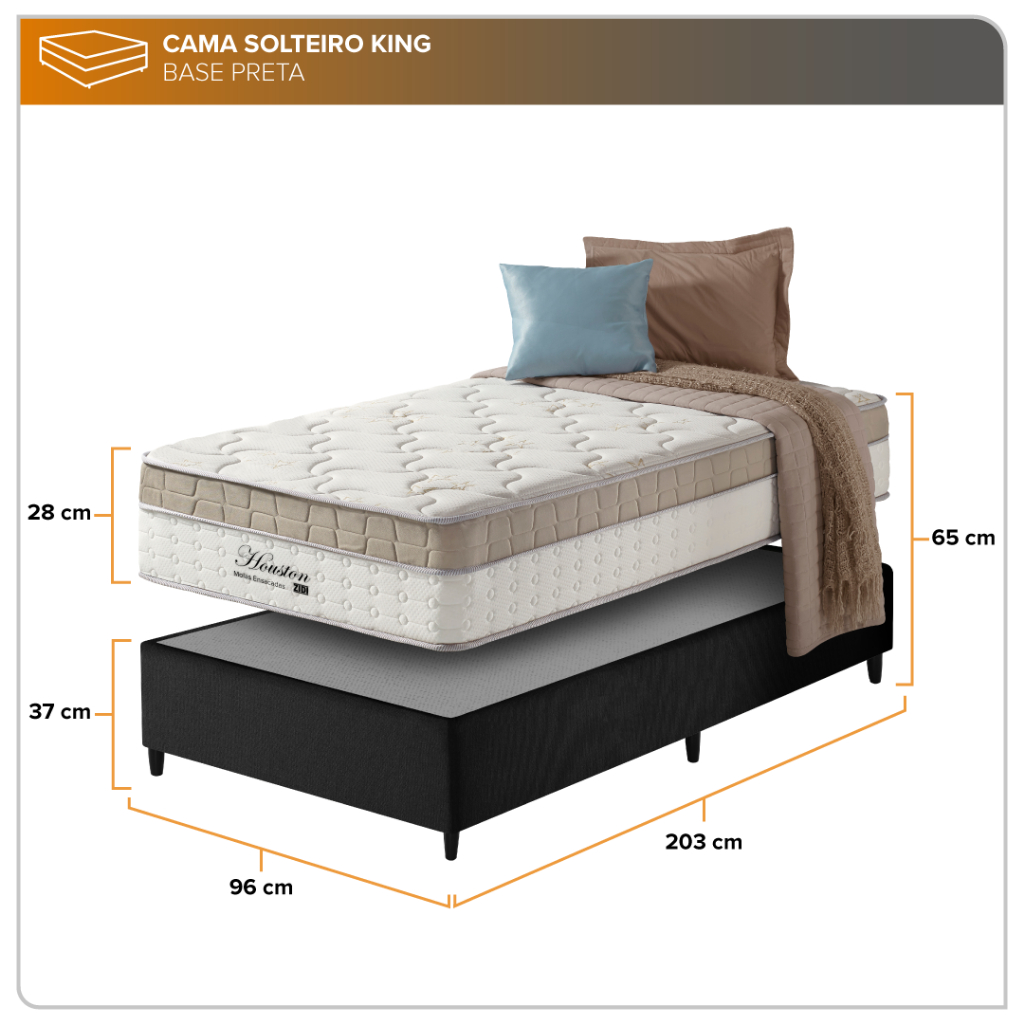 Colchão Solteiro King Molas Ensacadas Houston Pillow In 96x203x28cm As molas ensacadas são responsáveis por garantir uma excelente noite de sono. Trata-se de um sistema que opera de maneira individual, sendo independentes umas das outras, assegurando assim a longevidade da vida útil do colchão, já que quando alguém se deita, os movimentos ondulatórios são minimamente percebidos, proporcionando um conforto significativo durante o sono. DETALHES DO COLCHÃO Tipo de Pillow: Pillow In - Tipo de pillow tradicional, onde a camada de conforto está inserida no matelassê (acolchoado) do colchão, sendo que abaixo dessa camada se encontram as camadas de suporte. Tipo de Bordado do Tampo: Bordado Matelassê - Este método confere volume ao tecido, ampliando a sensação de suavidade e conferindo ao colchão um visual esteticamente agradável. Além de embelezar, ele contribui para uma noite de sono aconchegante e confortável, garantindo bem-estar e uma notável maciez. Tipo do Tecido do Tampo e da Lateral: Malha - De modo geral, podemos dizer que a malha é uma estrutura criada a partir de uma tecelagem específica, com o ato de entrelaçar os fios em um sentido constante. Isso confere, ao mesmo tempo, flexibilidade e força à peça, tornando-a muito resistente e maleável. Tratamento dos tecidos: Possui um tratamento especial contra ácaros e outras bactérias, prevenindo e evitando crises alérgicas causadas por ácaros presentes na poeira doméstica. No Turn ou No Side: O sistema No Turn ou No Side elimina a preocupação de virar seu colchão com frequência. Tipo de Estrutura: Molas Ensacadas - Produzidas em formato barril, são pré-comprimidas e confeccionadas em fio de aço com alto teor de carbono e espessura 2.0. Camadas de Espuma: Aglomerado de espuma D70 - A espuma aglomerada se caracteriza por ser um bloco compacto feito a partir da prensa de espumas de poliuretano, permitindo que colchões de densidades superiores a D45 sejam produzidos com uma qualidade superior. Moldura Perimetral: Polyframe - Sistema usado nos colchões de molas, composto por um quadro que envolve com borda de espuma de alto suporte (D26) em toda a lateral do colchão. Tipo de Base: PR - Uma chapa laminada (especial) de poliestireno com função de fornecer suporte base de apoio para sustentar o colchão. Características: Suporte de peso ideal de até 120 kg por pessoa. Possui o nível intermediário de conforto. Produto aprovado pelo INMETRO com certificação de alta qualidade nos padrões para exportação. Produto ecológico é aquele que apresenta características não poluentes, não tóxicos e, sobretudo, benéficos para o meio ambiente e a saúde, contribuindo para o desenvolvimento de um modelo econômico e social sustentável. Até 1 (um) ano de garantia, oferecida pelo fabricante. Produto de excelente qualidade e excelente acabamento, produto com muita presença, com conforto intermediário, possui também tecido de boa qualidade em seu tampo, em resumo um produto de ótima qualidade por todo o seu composto e por seu excelente custo-benefício. Em nossa qualificação com nota de 1 a 10, qualificamos este produto com nota 8. Dimensões: Altura: 28 cm Largura: 96 cm Profundidade: 203 cm Peso: 16,850 kg Base Cama Box Solteiro King 96x203x37cm Um colchão precisa de um ótimo box para ficar seguro e estável, que seja forte e bonito e é isso que nosso box oferece. O box é produzido com madeira de Eucalipto para garantir uma estrutura firme e resistente. O acabamento em suede dá um toque sofisticado e moderno à base, facilitando também a limpeza dela. Para proporcionar ainda mais estabilidade, os pés são de plástico. Características do Box: Estrutura Interna em Madeira de Eucalipto 100% de Reflorestamento. Estrutura Externa Em Suede. Pés em Plástico de 12 cm. Tratamento Antiácaro e Antialérgico. Possui Tecido Antiderrapante. Suporte de até 120 kg por Pessoa. Necessita Montagem dos Pés. Dimensões Altura com os pés: 37 cm Largura: 96 cm Profundidade: 203 cm Peso: 18,200 kg Garantia do Fabricante: 12 Meses Observações: Produto não acompanha acessórios decorativos. Imagens meramente ilustrativas. O produto pode ter pequenas variações de cores a depender da tela de visualização. Em caso de devolução, o produto deve ser devolvido em sua embalagem original e sem sinais de uso. A entrega do produto é realizada por transportadora, não subimos escadas ou elevadores com o produto. Não inclui serviço de montagem.