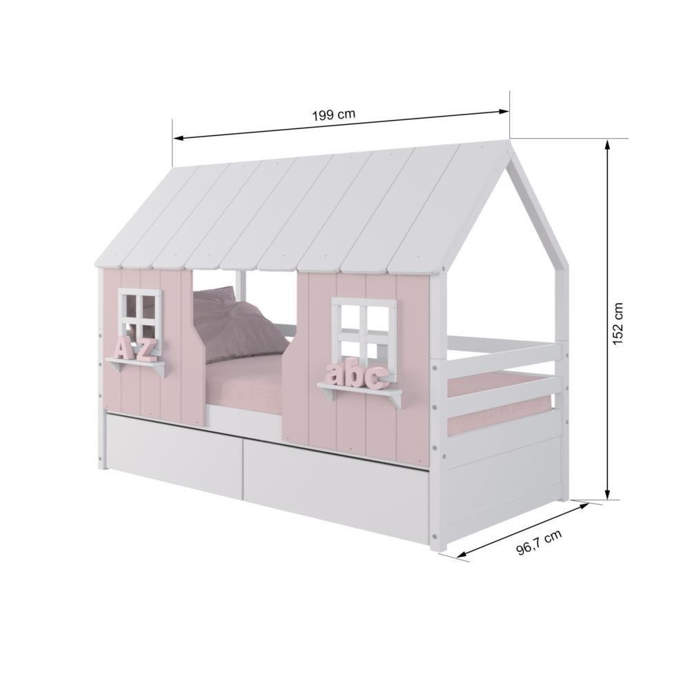Cama Casinha Encantada Com 02 Gavetas Madeira Maciça Rosa/ Branco Housin DETALHES DO PRODUTO Material: Madeira Maciça de Pinus de Reflorestamento Pintura/Acabamento: Rosa/ Branco PU (pode mostrar veios da madeira) Medida do Colchão da Cama (cm x cm): 88x188 (Não incluso) Peso Suportado Cama : 120 Kg Diferenciais: Casinha e Telhado com fechamento em MDF, 02 Janelas e Prateleira Decorativa e 02 Gavetas com Rodízios. DIMENSÕES Largura (cm): 199 Altura (cm): 152 Profundidade (cm): 96,7 INFORMAÇÕES COMPLEMENTARES Necessita de Montagem: SIM (Acompanha Manual de montagem) Atenção: Não realizamos serviço de montagem e instalação. Imagens meramente ilustrativas. Cores e tonalidades podem variar. Garantia do Fabricante: Prazo de 3 meses por defeito de fabricação EMBALAGEM Peso (Kg): 77 Quantidade de Volumes: 04 Material Principal: Madeira Maciça | Cor: Rosa/ Branco | Necessita Montagem: Sim | Acompanha Colchão: Não | Tipo de Cama: Solteiro