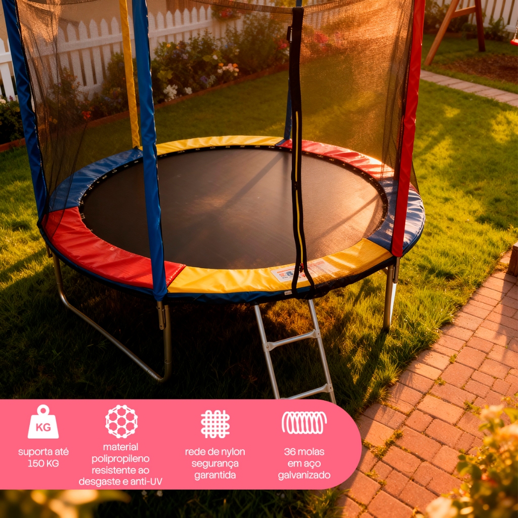 Cama Elástica Pula Pula 1,83m Infantil C/ Molas Até 150 Kgs Transforme seu quintal em um verdadeiro parque de diversões com a Cama Elástica Infantil . Proporcione momentos inesquecíveis de alegria, saúde e segurança para seus filhos. Esta cama elástica é perfeita para incentivar a atividade física e garantir horas de diversão ao ar livre. Ideal para reunir a família e amigos, promovendo interação e entretenimento de qualidade. Características Principais: Estrutura de Aço Sólido • Estrutura de aço totalmente galvanizado, resistente à ferrugem e corrosão, garantindo durabilidade e segurança. • 3 pernas grandes em forma de U com 6 pontos de contato equilibrados para maior estabilidade. Durabilidade Excepcional • Tapete de salto feito de material PP, resistente ao desgaste e anti-UV, suportando alta pressão e uso contínuo. • Equipado com 36 molas galvanizadas, proporcionando excelente elasticidade para pulos mais altos e suaves. Segurança Total • Rede de proteção firmemente conectada aos postes de aço galvanizado com mangas de espuma, eliminando espaços entre a rede e o tapete de salto. • Rede completamente visível, criando um ambiente seguro e permitindo que você observe seus filhos enquanto se divertem. • Zíper na tela de proteção para maior segurança e fácil acesso. Capacidade de Carga Impressionante • Suporta até 150 kg, permitindo que várias crianças brinquem juntas, compartilhando momentos de diversão e alegria com segurança. Todas as fotos são reais de nossos produtos, Qualquer duvida estamos a disposição.