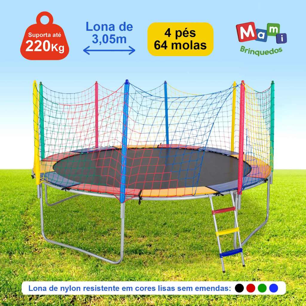 **Cama Elástica Colorida 3,05m Nacional com Lona de Salto Preta sem Emendas - PapiBrink e Suporte de Borracha que Suporta até 220KG!!** A **Cama Elástica Nacional 3,05m PapiBrink** é um brinquedo indispensável para festas infantis e ambientes recreativos. Este modelo é ideal tanto para uso em espaços privados, como casas e clubes, quanto em locais públicos, como creches e centros esportivos. --- **Características do Produto:** - **Estrutura resistente:** Feita em aço galvanizado a fogo (interno e externo), com espessura de 1,55 mm ou chapa 16, garantindo alta durabilidade e proteção contra ferrugem. - **Pés em formato de “W”:** Oferecem maior estabilidade ao produto. - **Lona de salto preta sem emendas:** Fabricada em nylon com proteção UV, que previne desgaste precoce e garante maior resistência aos raios solares. - **Rede de proteção colorida:** Confeccionada em malha 11 para garantir segurança extra. - **Protetor de molas colorido:** Com espuma de alta densidade e revestimento em PVC impermeável, evitando contato direto com as molas. - **Escada com degraus coloridos:** Plataforma resistente que não machuca os pés das crianças. - **Suporte de borracha:** Garante maior proteção, evitando que o equipamento se desloque durante o uso. - **Isotubos blindados coloridos (Protectube):** Contam com proteção UV para maior durabilidade. --- **Diferenciais:** - Inclui **64 molas galvanizadas**, que oferecem maior durabilidade e impulsão em comparação aos elásticos presentes em alguns modelos importados. - **Fácil montagem:** Sistema de encaixe manual que não necessita de ferramentas ou parafusos. --- **Vantagens ao Comprar uma Cama Elástica PapiBrink:** 1. **Reposição de peças acessível:** As peças podem ser rapidamente substituídas, diferentemente de alguns modelos importados. 2. **Apoio à indústria nacional:** Incentiva o crescimento econômico local e fortalece marcas brasileiras. 3. **Custo-benefício superior:** Produtos nacionais eliminam custos de importação, mantendo preços competitivos. 4. **Impacto positivo na economia:** Fomenta o comércio e a produção local. 5. **Sustentabilidade e orgulho nacional:** Apoia práticas alinhadas ao desenvolvimento social e ambiental no Brasil. A **Cama Elástica PapiBrink** reúne diversão, qualidade e segurança, sendo uma excelente escolha para crianças e adolescentes.