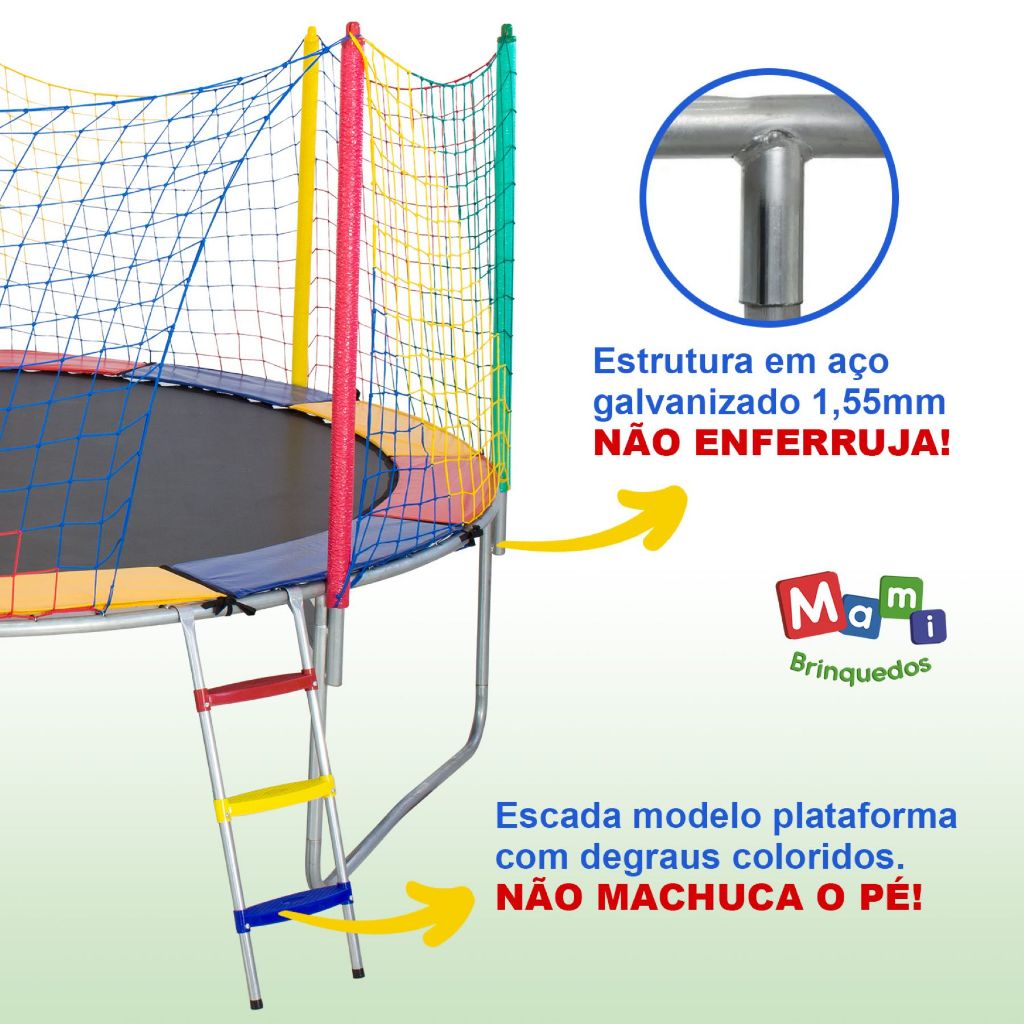 Cama Elástica Grande Colorida 4,27m Nacional com Lona de Salto Preta sem Emendas e Suporte de Borracha PapiBrink Suporta até 280KG!! A Cama Elástica Nacional 4,27m PapiBrink é amplamente reconhecida por sua qualidade e versatilidade, sendo indispensável para festas infantis e locação de brinquedos. É uma opção ideal para ambientes privados e públicos devido ao seu tamanho e estrutura robusta. Características do Produto: - Estrutura fabricada em aço galvanizado a fogo, com espessura de 1,55 mm ou chapa 16, altamente resistente e protegida contra ferrugem. - 4 pés em formato “W” que garantem maior estabilidade durante o uso. - Lona de salto preta sem emendas, feita em nylon com proteção UV, proporcionando durabilidade e resistência contra raios solares. - Rede de proteção colorida confeccionada em malha 11, assegurando segurança adicional. - Protetor de molas feito em espuma de alta densidade e revestido em PVC impermeável, evitando contato direto com as molas. - Escada com degraus coloridos no formato de plataforma, proporcionando conforto e segurança às crianças. - Isotubos blindados com proteção UV, aumentando a durabilidade dos componentes. - Suporte de borracha para os pés, que protege o piso, reduz impactos e diminui os ruídos durante o uso. Diferenciais: - 72 molas galvanizadas, que oferecem melhor impulsão e maior resistência em comparação aos elásticos frágeis de outros modelos. - Sistema de montagem prático e rápido, dispensando a necessidade de ferramentas ou parafusos. Vantagens ao Comprar uma Cama Elástica PapiBrink: 1. Acesso fácil e rápido a peças de reposição. 2. Incentivo ao desenvolvimento da indústria nacional e valorização de marcas brasileiras. 3. Excelente custo-benefício, eliminando custos extras de importação. 4. Apoio à produção e comércio local, promovendo impacto positivo na economia. 5. Sustentabilidade e orgulho em consumir produtos nacionais. A Cama Elástica PapiBrink reúne diversão, segurança e durabilidade, sendo uma excelente escolha para diferentes eventos e públicos. Se precisar de mais informações, estou à disposição.