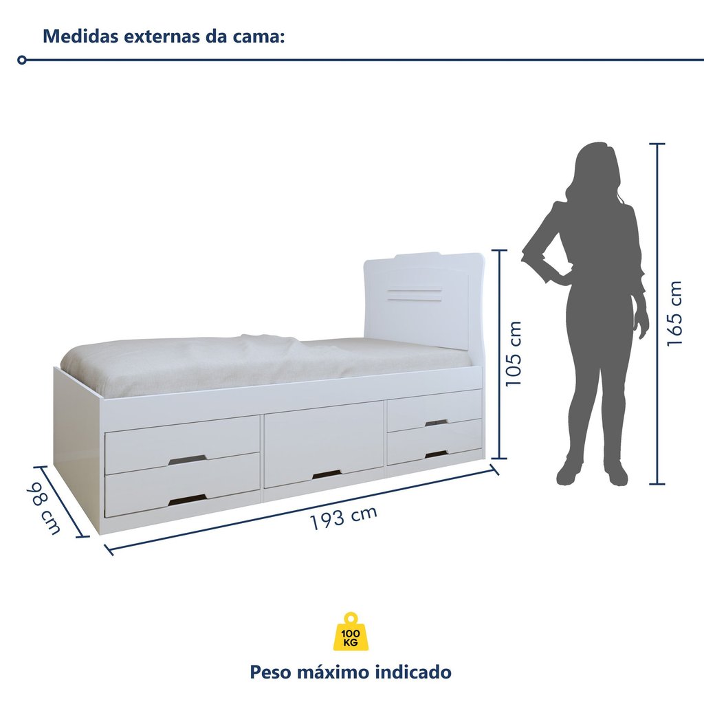 Maximize o espaço do seu quarto com a Cama Solteiro Alice! Com 5 gavetas práticas e espaçosas, ela é perfeita para quem busca otimizar a organização sem abdicar do estilo. A Cama Alice oferece armazenamento extra para roupas, acessórios e objetos pessoais, mantendo tudo sempre à mão e o ambiente mais organizado. Ideal para quartos pequenos ou para quem deseja um espaço funcional e moderno, a Cama Solteiro Alice transforma o ambiente com elegância e praticidade. Invista em conforto e aproveite cada detalhe dessa cama projetada para o seu bem-estar. Não perca a chance de ter a sua! Estilo: Moderno Peso (kg): 51 Garantia: 03 Meses Altura (cm): 105 Acabamento: Pintura UV Largura (cm): 193 Possui Baú: Não Possui Pés: Não Tipo de Cama: Convencional Possui Portas: Não Possui Gavetas: Sim Possui Rodízio: Não Suporta Até (kg): 100 Tipo de Estrado: Fixo Escala de Brilho: Semi-Brilho Gaveta com Chave: Não Acompanha Colchão: Não Origem do Produto: Nacional Ambiente Principal: Quarto Infantil Material da Gaveta: MDF/MDP Material Principal: MDF/MDP Possui Prateleiras: Não Material do Estrado: pinus e eucalipto Acabamento da Gaveta: Pintura Peso Máximo por Gaveta: 5 Acompanha Cama Auxiliar: Não Tipo de Puxador da Gaveta: Embutido Escala de Brilho da Gaveta: Brilhante Tipo de Corrediça da Gaveta: Metálica Simples Altura do Estrado até o Chão: 44.5 Permite a Utilização de Cama Auxiliar: Não Marca: Conquista Móveis Cor Flex: Não Cor: Branco Cor do Produto: Branco Itens Inclusos: 1 Cama + 1 Manual de Montagem + 1 Kit Ferragens Cor Predominante: Branco Linha ou Coleção: Júlia Quantidade de Gavetas: 05 Gavetas Tamanho do Colchão Indicado (L x C): 88cm x 188cm