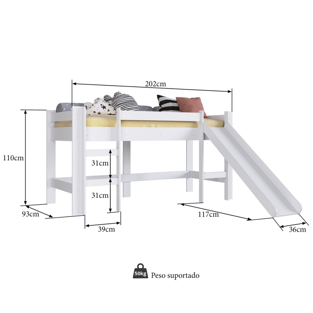 Dimensões: - Altura: 110,00 cm - Largura: 202,00 cm - Profundidade: 210,00 cm - Peso: 40,900 kg Descrição: O(a) Cama Infantil com Escorregador Bb1001 Branco - Completa Móveis é produzido em MDP na escala de brilho Fosco, e possui um grau de dificuldade de montagem: Médio. Seu revestimento/acabamento é: Pintura BP. Infelizmente a Loja não oferece serviço de montagem, deixamos essa informação bem clara em todas as nossas páginas de produto. Onde especificamos que os móveis chegarão desmontados, e que a montagem fica por conta do cliente. Como não oferecemos esse serviço não embutimos o mesmo no preço dos produtos, ou seja, maior economia para você! Todos os nossos móveis também acompanham o manual de montagem, e caso você queira, pode realizar a montagem você mesmo, sempre especificamos os graus de montagem dos produtos. Nos casos de grau baixo e médio, com pouco ou nenhum conhecimento, você mesmo pode efetuar a montagem, e fazer essa economia. Apenas nos graus de montagem alto, recomendamos a contratação de um montador com experiência, visto que são montagens mais complicadas. A montagem é feita com Parafusos, Cavilhas, Porca Elíptica e Sapata Plástica. Este móvel é indicado para que seja utilizado no(a) Quarto Infantil, dando um toque especial no cômodo de sua casa. Para que você mantenha seu produto sempre em ótimo estado, recomendamos que use apenas um pano seco ou levemente umedecido, sem o uso de quaisquer produtos abrasivos. A Loja garante aos clientes, 90 dias de garantia nos produtos, porém, recomendamos que entre em contato com o fornecedor/marca do produto, pois o mesmo(a), pode garantir um prazo maior de garantia. Lembrando ainda que: quaisquer objetos decorativos que aparecem nas imagens, não acompanham o produto. Características: - Espessura da Estrutura: 15mm - Possui Gavetas?: Não - Possui Portas?: Não - Possui Vidro?: Não - Possui Espelho?: Não - Possui Prateleiras?: Não - Possui Puxadores?: Não - Possui Ripamento?: Não - Montagem Invertida?: Não Pode ser Montado Invertido - É frágil?: Sim - Material da Estrutura: MDP - Escala de Brilho: Fosco - Acompanha Cabeceira?: Não - Possui Rodízios?: Não - Possui Pés?: Não - Pés com regulagem de altura?: Não - Quantidade de Pés/Sapatas: 9 - Possui Borda de PVC nas Bordas?: Não - Acompanha Cama Auxiliar: Não Possui - Acompanha Colchão: Não - Acompanha Espelho: Não - Acompanha Mesa de Cabeceira: Não - Colchão Indicado: King ( 186 cm de largura ) - Tipo de cama: Infantil - Acompanha: Cama Infantil com Escorregador - Como os Móveis Chegarão na Minha Casa: Desmontados, em caixas, acompanhados de todas as peças, ferragens e manuais para montagem - Grau de Dificuldade da Montagem: Médio - Necessita de Montagem: Sim - Sistema de Montagem: Parafusos, Cavilhas, Porca Elíptica e Sapata Plástica - Garantia (dias): 90 - Indicação de Uso: Quarto Infantil - Observação: Objetos decorativos que aparecem nas imagens, não acompanham o produto. Cama suporta até 50 Kg. - Recomendação de Manutenção: Pano seco ou umedecido, não utilizar quaisquer produtos abrasivos - Revestimento /Acabamento: Pintura BP