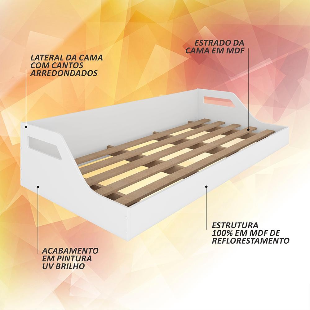 Cama Nami com cantos arredondados para melhor segurança. Design Lúdico e mais aconchegante para o quarto das crianças. Medidas do Produto Montado: A:38cm x L:94,2cm x P:193,6cm Detalhes Técnicos: MDF 18mm Acabamento: Pintura UV Brilho Borda: PU Tonalidade: Branco Estrado: em MDF 25mm Peso suportado: suporta até 100kg distribuídos Ideal para colchão Solteiro de 188x88cm Possui colchão: NÃO Conteúdo da Embalagem: 1 Cama Manual de Montagem Kit Acessórios Observações Importantes - Imagens ambientadas meramente ilustrativas, objetos decorativos não compõe o produto; - Produto novo, garantia somente para defeitos de fabricação: 3 meses; - Não realizamos entregas em zonas rurais, via caminhos fluviais e distritos, NÃO ACEITAMOS CEP GERAL; - Não trabalhamos com entrega agendada. O recebedor deve ter mais de 18 anos. O valor do frete não inclui: subida de escada, elevador ou lançamento de produto, em condomínio residencial a entrega é feita somente até a portaria. As entregas são realizadas em dias e horários comerciais; - Ao receber o produto observe se a embalagem está em perfeita condição. Confira atentamente a quantidade de volumes; - Produto entregue desmontado. É responsabilidade do cliente a montagem/instalação do produto, inclusive despesa para sua realização. Recomendamos a contratação de um profissional especializado; - Evitar a exposição direta à luz solar e à umidade. Limpar com pano macio e seco, não utilizar produtos químicos; - A cor do produto pode variar de acordo com o monitor, a iluminação do ambiente ou sua percepção visual.