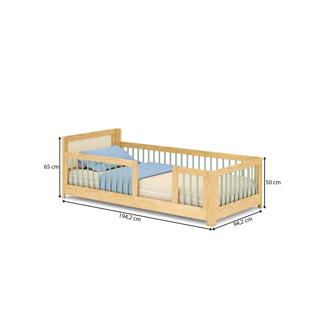 Cama Infantil Solteiro Montessoriano Wave com Rattan Casatema Verde/Natural