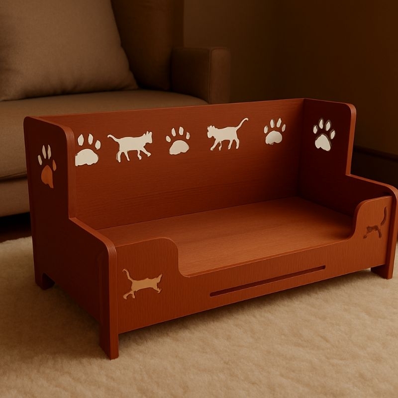 Cama Pet em MDF Marrom Rústico – Design Artesanal com Recortes de Patinhas e Gatinhos