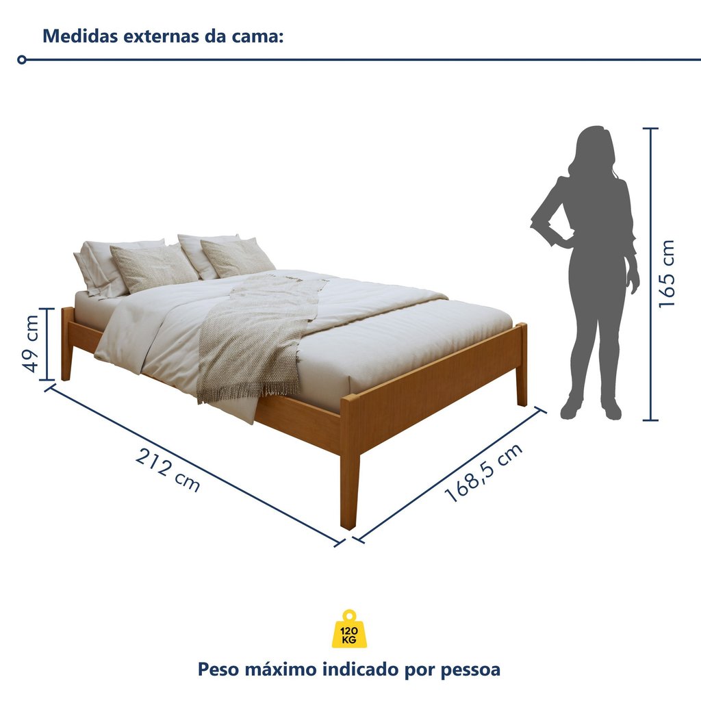 Transforme seu quarto de casal em um verdadeiro refúgio de conforto e estilo com a nossa incrível cama de casal em madeira maciça! Ideal para quem busca um design clean e moderno, nossa cama traz a robustez e a elegância da madeira maciça, garantindo durabilidade e resistência para suas noites de descanso. Seu visual minimalista combina perfeitamente com qualquer decoração, enquanto o espaço livre atrás da cama proporciona uma sensação de amplitude ao ambiente. Aposte na funcionalidade e beleza que essa cama de casal sem cabeceira pode oferecer para o seu lar! A cama de casal é segura? Claro, suas barras, estrados e travessões também são em madeira maciça. Qual é a diferença entre cama de casal e cama queen? A diferença está nas medidas. A cama de casal queen é um pouco maior. Peso (kg): 60 Garantia: 03 Meses Altura (cm): 49 Acabamento: Pintura Largura (cm): 168.5 Possui Baú: Não Possui Pés: Sim Tipo de Cama: Convencional Possui Nichos: Não Possui Portas: Não Altura dos Pés: 49 Comprimento (cm): 212 Possui Gavetas: Não Possui Rodízio: Não Suporta Até (kg): 120 Possui Espelhos: Não Tamanho da Cama: Queen Tipo de Estrado: Removível Escala de Brilho: Semi-Brilho Material dos Pés: Madeira Maciça Acompanha Colchão: Não Origem do Produto: Nacional Rodízio com Trava: Não Acabamento dos Pés: Pintura Ambiente Principal: Quarto Material Principal: Madeira Maciça Possui Prateleiras: Não Material do Estrado: Madeira Possui Escrivaninha: Não Sapatas Niveladoras: Não Tipo de Madeira Maciça: Tauari Acompanha Cama Auxiliar: Não Tipo de Madeira Maciça dos Pés: Tauari Altura do Estrado Superior até o Chão: 38 Permite a Utilização de Cama Auxiliar: Não Marca: Josandro Cor: Amêndoa Mel Cor do Produto: Amêndoa/Mel Itens Inclusos: 1 Cama, Kit Ferragens e Manual de Montagem. Cor Predominante: Marrom Linha ou Coleção: Turca Tamanho do Colchão Indicado (L x C): 158cmx198cm