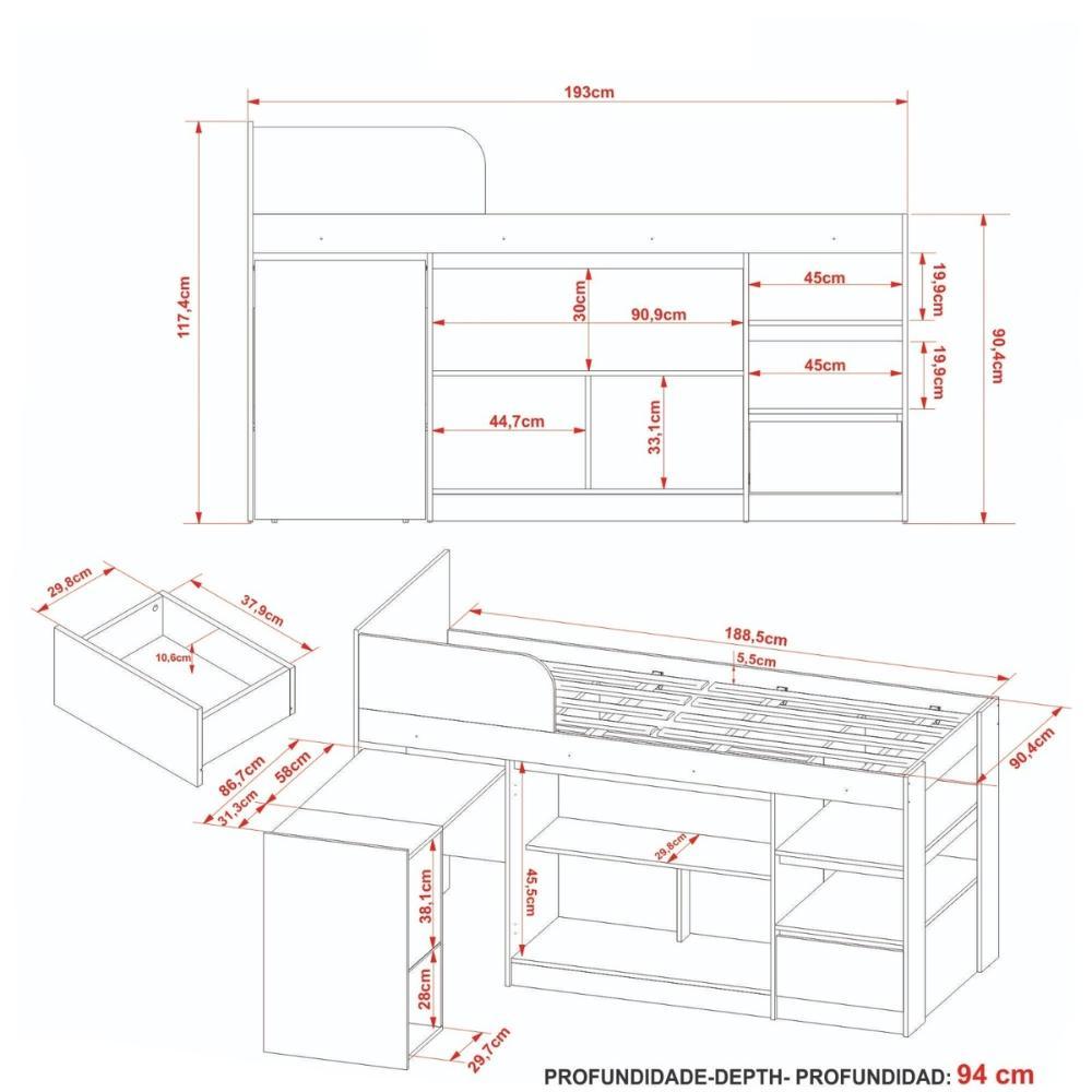 A Cama Solteiro com Escrivaninha para Colchão 88 x 188 cm Multimóveis é produzida em MDP com acabamento em BP (Suporta até 130kg), o que garante maior durabilidade e resistência. Produto com diversas funcionalidades para agregar conforto e praticidade no ambiente. Conta com gaveta, prateleiras e nichos com um amplo espaço para armazenar itens pessoais ou de decoração. Possui escrivaninha retrátil para otimização de espaço possibilitando que seu filho tenha um cantinho de estudos no conforto do seu quarto. Conteúdo da Embalagem: 1 (uma) Cama Manual de Montagem Kit Ferragem Dimensões do produto montado: Altura: 117,5cm | Largura: 193cm | Profundidade: 94cm *Tamanho máximo do colchão (L x A x P): 90,5 x 18 x 190cm *Você pode consultar as medidas detalhadas na imagem técnica do produto. *As cores do produto podem sofrer variações de tonalidade de acordo com as configurações do seu dispositivo. Imagem meramente ilustrativa. Decoração não acompanham o produto. O produto será entregue desmontado e não disponibilizamos o serviço de montagem.