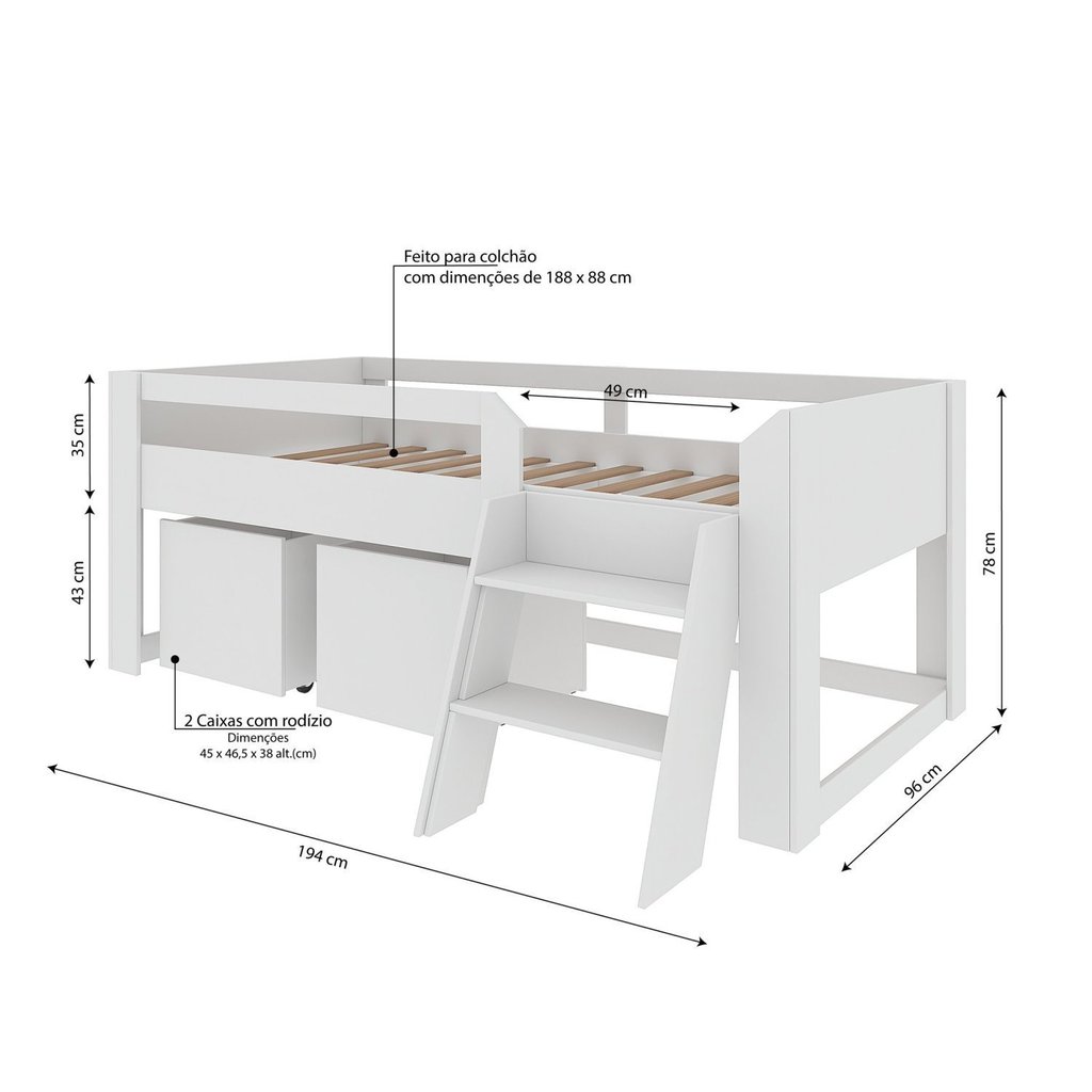 A Cama Infantil Serena é o mais novo lançamento da linha infantil da Yescasa, desenvolvida em material de excelente qualidade, traz maior segurança e sofisticação para o quarto dos pequenos. Para que seu filho possa utilizá-la de forma confortável e com autonomia, conta com escada, grades de proteção laterais e dois baús para brinquedos. A Cama Infantil Serena é a escolha perfeita para você que busca um produto com design exclusivo para deixar o cantinho do seu filho completo. Lembrando que essa cama é tamanho padrão solteiro. Estilo: Moderno Modular: Não Peso (kg): 60.1 Garantia: 03 Meses Altura (cm): 78 Acabamento: BP Extensível: Não Largura (cm): 194 Possui Baú: Sim Possui Pés: Sim Tipo de Cama: Convencional Possui Portas: Não Altura dos Pés: 1.5 Possui Casinha: Não Possui Estante: Não Possui Gavetas: Não Possui Rodízio: Sim Possui Telhado: Não Suporta Até (kg): 100 Profundidade (cm): 129 Tamanho da Cama: Solteiro Tipo de Estrado: Fixo Escala de Brilho: Semi-Brilho Material dos Pés: Plástico Acompanha Colchão: Não Origem do Produto: Nacional Possui Iluminação: Não Rodízio com Trava: Não Acabamento dos Pés: BP Ambiente Principal: Quarto Infantil Material Principal: MDF Possui Prateleiras: Não Acompanha Cabeceira: Não Material do Estrado: Madeira Multilaminada Possui Escrivaninha: Não Sapatas Niveladoras: Não Acompanha Escorregador: Não Acompanha Cama Auxiliar: Não Tipo de Grade de Proteção: Grade Acompanha Grade de Proteção: Sim Altura do Estrado até o Chão: 43 Informações Complementares (Novo): O produto possui baús com rodízios, que servem como espaço de armazenamento Permite a Utilização de Cama Auxiliar: Não Marca: Yescasa Cor Flex: Não Cor do Produto: Branco Itens Inclusos: 1 Cama Infantil, Kit Ferragens e Manual de Montagem Cor Predominante: Branco Linha ou Coleção: Serena Tamanho do Colchão Indicado (L x C): 88x188cm