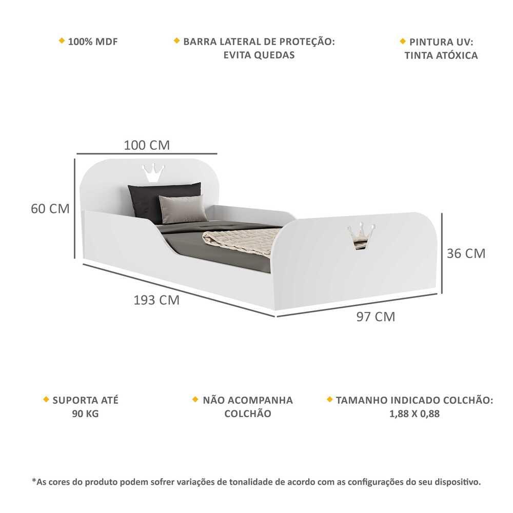 A Cama Solteiro Montessoriana Encantada Multimóveis é produzida em MDF, que garante maior durabilidade e resistência, e possui acabamento acetinado (cerca de 20% de brilho). Com barras de proteção lateral (evita quedas), a cama suporta até 90 kg. NÃO acompanha colchão. Tamanho indicado colchão: 1,88 x 0,88. Conteúdo da Embalagem: 1 (uma) Cama Kit Ferragem Manual de Montagem Dimensões do produto montado: Altura: 60cm | Largura: 193cm | Profundidade: 100cm *Você pode consultar as medidas internas na imagem técnica do produto. *As cores do produto podem sofrer variações de tonalidade de acordo com as configurações do seu dispositivo. Imagem meramente ilustrativa. Decoração não acompanha o produto. O produto será entregue desmontado e a Multimóveis não disponibiliza o serviço de montagem.