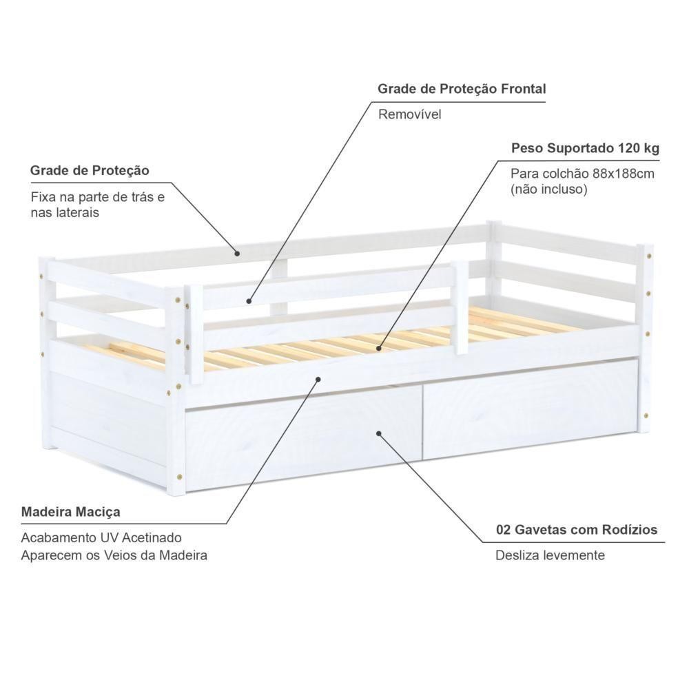 Cama Solteiro Slim Com 02 Gavetas E Grade De Proteção Madeira Maciça Branco Housin DETALHES DO PRODUTO Material: Madeira Maciça de Pinus de Reflorestamento Pintura/Acabamento: Branco UV (pode mostrar veios da madeira) Medida do Colchão da Cama (cm x cm): 188x88 (Não incluso) Peso Suportado Cama :120 Kg Diferenciais:Todo em Madeira, Grade de Proteção, 02 Gavetas. DIMENSÕES Largura (cm):199,5 Altura (cm):68 Profundidade (cm):96,7 INFORMAÇÕES COMPLEMENTARES Necessita de Montagem: SIM (Acompanha Manual de montagem) Atenção: Não realizamos serviço de montagem e instalação. Imagens meramente ilustrativas. Cores e tonalidades podem variar. Garantia do Fabricante: Prazo de 3 meses por defeito de fabricação EMBALAGEM Peso (Kg):47 Quantidade de Volumes:03 Material Principal: Madeira Maciça | Cor: Branco | Necessita Montagem: Sim | Acompanha Colchão: Não | Tipo de Cama: Solteiro