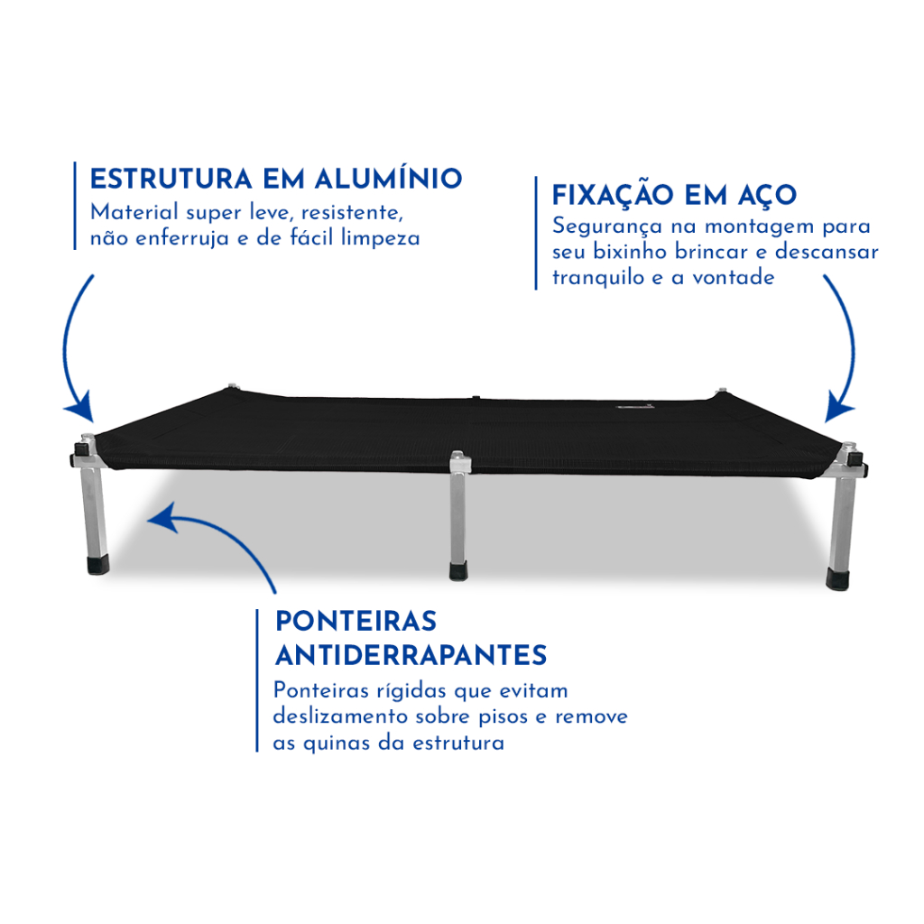 Confortáveis e duráveis, as Cama Suspensas da Pet Best Soluções possuem estrutura em alumínio e apoio em poliéster emborrachado que se molda ao corpo do pet, permite circulação do ar, evita assaduras e contém aditivos anti-fungos e anti-UV. A estrutura de alumínio garante resistência física e não enferruja. O sistema de fixação em aço de simples montagem que permite a troca da tela a qualquer hora. Higiênica, a tela e a estrutura pode ser limpa com água e sabão. Resistente a corrosões proporcionadas pela urina dos pets. Ponteiras antiderrapantes que mantém a cama no lugar mesmo em pisos lisos e escorregadios , sem quinas vivas, para segurança do seu Pet. Acabamento com viés para maior durabilidade e qualidado do produto. Benefício de uso: Tecido arejado, permite ventilação portanto previne micoses, dermatites e evita a proliferação de pulgas, ácaros e carrapatos. Suspensa, mantem a temperatura corporal do animal, livrando da umidade e do frio do inverno. Tecido moldável, protege os ossos e articulações. Dimensões da Cama Suspensa Pet Best Soluções (G) Comprimento: 90 cm | Largura: 60 cm | Altura: 13 cm | Suporta até 35Kg Atenção: Escolha sempre um tamanho maior que o pet para que ele possa ter espaço suficiente para se movimentar na cama. Tamanho indicado para cachorros de cachorros e outros pets grandes. Material Tela: Tela poliéster de alta tenacidade revestido com PVC, contém aditivos AntiUV e AntiFungos Estrutura: Tubos de alumínio Fixação: Parafusos em aço carbono Ponteiras: PVC flexível Itens inclusos: 01 cama suspensa Pet Best Soluções 01 manual de montagem Garantia do vendedor: 3 meses