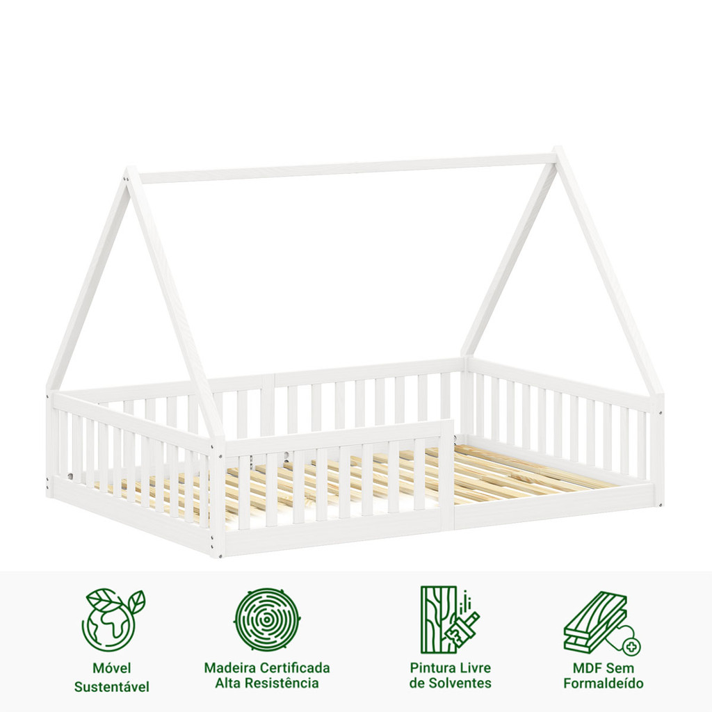 Cama Viúva Infantil Montessori Branco Madeira Casa com Estrado Stella