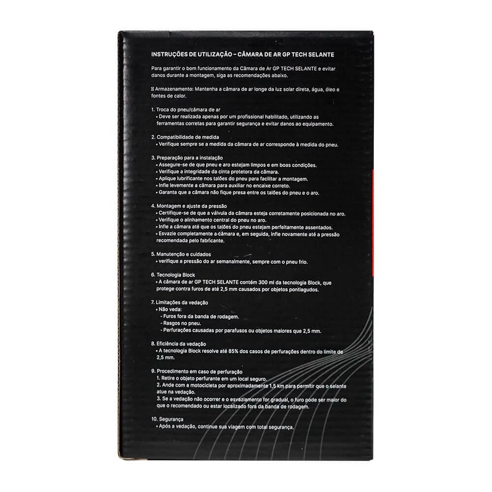 CAMARA AR GP TECH COM SELANTE A-21 90/90-21 / 3.00-21 / 2.75-21 / 3.00-21 / 80/90-21 CAMARA AR GP TECH COM SELANTE 1. Retire o objeto perfurante em um local seguro. 2. Ande com a motocicleta por aproximadamente 1,5 km para permitir que o selante atue na vedação. 3. Se a vedação não ocorrer e o esvaziamento for gradual, o furo pode ser maior do que o recomendado ou estar localizado fora da banda de rodagem. Segurança Após a vedação, continue sua viagem com total segurança. Precauções Não reutilize o líquido selante. Em caso de contato com os olhos ou pele, lave com água em abundância. Em caso de ingestão, procure um médico imediatamente. Composição Borracha natural, pó de pneu, H2O, agentes adesivos naturais, espessante, cobre, níquel, aditivos naturais e anticorrosivo. Atenção A vedação ocorre instantaneamente de dentro para fora. Com a rotação das rodas, o selante cria uma fina camada protetora no interior da câmara de ar, sem afetar o balanceamento ou a dirigibilidade da motocicleta. Funciona com pressão mínima de 20 psi nos pneus. Nunca realize reparos pelo método a frio. O reparo deve ser feito exclusivamente por vulcanização. Em casos de perda excessiva do líquido selante, futuras perfurações podem não ser vedadas corretamente. O diâmetro máximo do objeto perfurante suportado pelo selante é de 2,5 mm. A GP Tech e a Block não se responsabilizam por danos decorrentes de erros na montagem e/ou uso indevido da câmara de ar. Importante: Câmaras de ar estão sujeitas a esvaziamento repentino devido a mau uso, erro de instalação ou perfurações fora dos limites garantidos. * Imagens meramente ilustrativas * Garantia de 90 dias contra defeito de fabricação. Maximize a Performance da Sua Moto: Conheça a Câmara de Ar GP Tech com Selante da Paulinho Motos" Adquira a Câmara de Ar para Pneu Moto GP Tech com Selante na Paulinho Motos. Garantia de qualidade e segurança para sua pilotagem. Confira já!