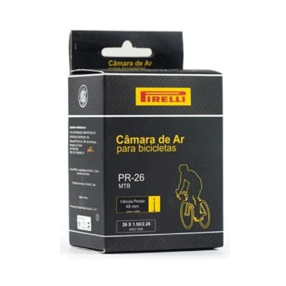 Câmara de ar Pirelli para bicicletas MTB Aro 26" compatível com pneus 26 x 1.50 - 2.20", com válvula Presta (fina) 48mm. Especificações e Atrativos: - Confeccionada em borracha natural com paredes de 0.9mm para alta resiliência; - Alta qualidade com peso razoável, ideal para uso recreativo e esportivo. Dados Técnicos: - Peso: Aprox. 160g.