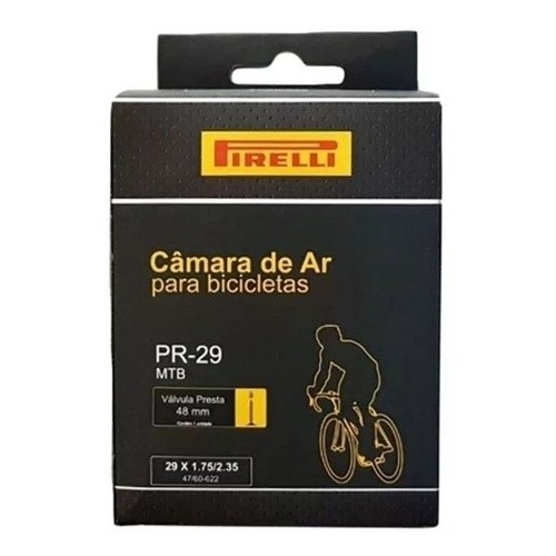Camara De Ar Pirelli Bicicleta Aro 29 Presta/bico Fino 48mm Promoção Por Tempo Indeterminado. Câmara de ar Pirelli MTB possui alto rendimento, alta durabilidade e alto custo beneficio. Extremamente leve, é produzida sob os mais rigorosos padrões de qualidade, serve em bicicleta 700x45 , 2.00 , 2.10 , 2.20 , 2.30 Especificações: Válvula: presta 48mm Medida: 29 X 1.75/2.35 Modelo: PR-29 Marca: Pirelli Peso: Aproximadamente 210g