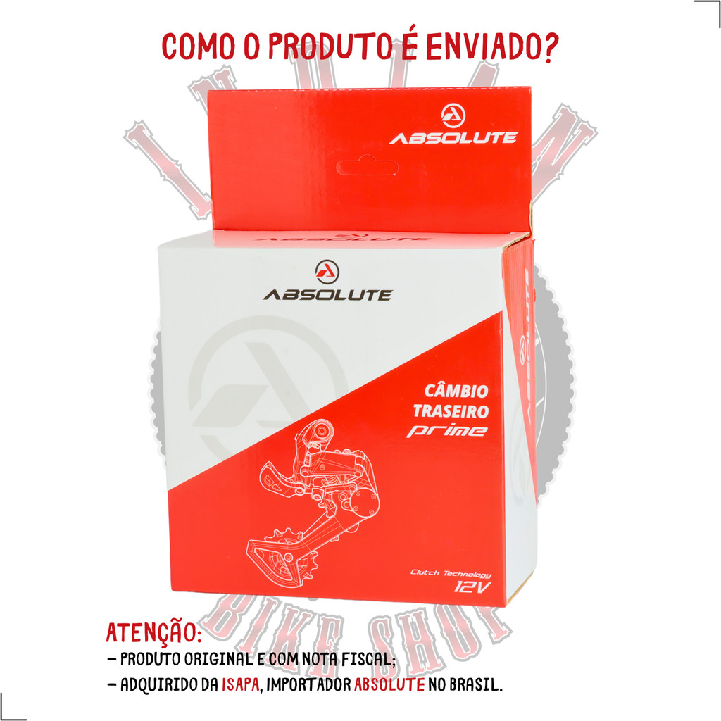 CÂMBIO TRASEIRO ABSOLUTE PRIME P/ 1X12V ATÉ 52D - 12V **Lançamento 2024** ATENÇÃO: - Específico para relações com coroa ÚNICA e 12 velocidades (1x12v) - NÃO TRAVABALHA COM PEDIVELA DUPLO; - Compatível com cassete de 12v: 11/50, 11/51 e 11/52 com pedivela SINGLE; - NÃO tem trava; - Sistema: CLUTCH – Maior pressão de mola; - Compatível com ALAVANCA de 12v: ABSOLUTE PRIME, SUNRACE, SHIMANO; - NÃO funciona perfeitamente com alavanca de outras marcas. Descrição: O câmbio traseiro ABSOLUTE tem ÓTIMA construção e EXCELENTE qualidade de materiais. Foi desenhado para trabalhar com cassete de até 52 dentes e não necessita de prolongador ou outro artifício para montagem. Esse câmbio NÃO TEM SISTEMA DE TRAVA, porém conta com sistema CLUTCH que garante maior pressão de mola. Indicado para 1x12v nível INTERMEDIÁRIO de uso. Modelo compatível com alavanca de 12v ABSOLUTE PRIME, SUNRACE, SHIMADO e com pedivela com coroa ÚNICA. Especificações: - Marca: ABSOLUTE; - Linha: PRIME; - Modelo: 12V; - Modalidade: MTB - INTERMEDIÁRIO; - Exclusivo para: Relação 1x12 Velocidades – NÃO COMPATÍVEL COM PEDIVELA DUPLO; - Compatível com ALAVANCA de 12v: ABSOLUTE PRIME, SUNRACE, SHIMANO; - Compatível com cassete de 12v: 11/50, 11/51 e 11/52 com pedivela SINGLE; - Polias: 12D Superior e 14D Inferior – ROLAMENTADA; - Tamanho máximo de dentes do cassete: 52D; - Capacidade total: 41D; - Fixação: DIRETA – Parafusado na gancheira do quadro; - Material: Alumínio, Aço e Plástico; - Cor: Preto; - Peso Aproximado: 286g; - Origem: CHINA; - Part. Number: 51272; - Cód. Barras: 6940194030480. Atenção: - Acompanha Embalagem Original; - Produto original ABSOLUTE; - Importado por ISAPA; - Garantia de 90 dias; - Acompanha nota fiscal. Aguardamos o seu pedido! INDIAN BIKE SHOP