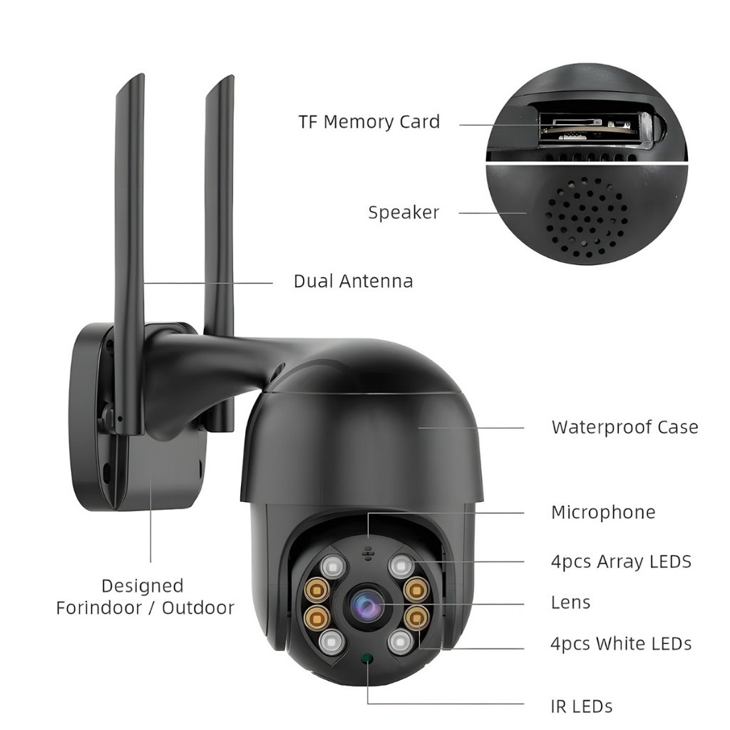 Sistema: icsee Câmera de segurança IP Wifi Full HD externa de alta velocidade dome Com slot para cartão de memória IR e SD de até 128 GB Android e iPhone Aplicativo de computador: CMS Compatível com protocolo ONVIf e pode ser usado com NVR Suporte para gravação em nuvem diretamente do aplicativo ICSee Detalhes do produto: Modelo: HZ-A8 Sensor de imagem: 1/3 CMOS Qualidade de imagem: FHD 1080p/SD 640x320 Lente: 6mm Modo dia e noite: IR-CUT muda automaticamente. Número de luzes infravermelhas: 4, até 50 metros Visão Noturna: Visão Noturna Inteligente em Cores Fonte de luz dupla preto e branco/cor/inteligente 4 luz branca + 4 infravermelha Ângulo de rotação: Pan 0-355°, Passo 0-90° Interface de rede: Ethernet Base 10/100M, interface RJ45 Detecção de movimento: Enviar alerta (não segue o alvo) Tamanho do produto: 20cm x 16cm x 11cm Tensão de entrada: saída DC 12V/2A entrada RJ45 Consumo de energia: 10W Detalhes de distância infravermelha: 15 M Peso: 0,55kg Tamanho do cabo da câmera: 45 CM Tamanho do cabo de fonte blindado: 25 CM Câmera de segurança IP Wifi Full HD externa de alta velocidade dome Com infravermelho e slot para cartão de memória SD de até 128 GB IP67 - O produto pode suportar condições climáticas adversas sem problemas. Fácil configuração via Wifi ou cabo de rede RJ45 padrão Não suporta rede de 5 GHz Itens incluídos: 01 câmera sem fio 02 antena Wi-Fi 01 Jogos 01 Manual do usuário Warranty Duration:1 Month Frame Rate:60 Video Capture Resolution:1080p Pack Size:1 Item Type:Accessory Has BSMI No.:No Recorder Channel Capacity:1 Dimension (L x W x H):23x10.5x10 Warranty Type:Supplier Warranty Memory Card Type:Micro Sd Digital Zoom:4 Optical Zoom:4 Security Camera Style:Bullet Mininum Aperture:8 Number of Cameras Included:1 Bundle Set:No Maximum Aperture:8 ISO Range:1 Quantity:1 Security Camera Features:App Support Model Name:A8
