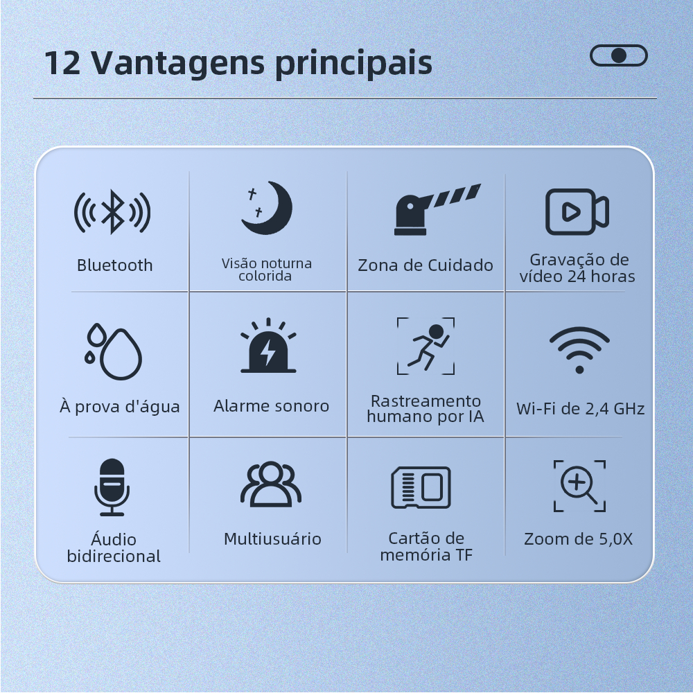 Câmera de lente tripla, telas duplas, zoom de 4x, alarme de luz, rastreamento de pessoas, monitoramento de voz bidirecional de 350 graus, visão noturna colorida, monitoramento remoto móvel, compartilhamento de vídeo, armazenamento em cartão SD (cartão de memória não incluído), gravação 24 horas. Câmera de lente tripla: O aplicativo oferece três visualizações de vídeo: duas para câmeras fixas e uma para câmeras rotativas. Áudio bidirecional: Microfone e alto-falante integrados/alto-falante personalizado. Você pode falar com qualquer pessoa que se aproxime da câmera Alerta de Detecção Humana: Detecta pessoas rapidamente e envia uma notificação instantânea para o seu telefone. O recurso de rastreamento automático mantém você informado sobre o que está acontecendo ao seu redor. Conexão Wi-Fi de 2,4 GHz e Cabo LAN Você só pode conectar a câmera a uma rede Wi-Fi de 2,4 GHz. Você pode configurar a câmera para conexão Wi-Fi ou LAN usando um cabo conectado a um roteador, mas isso só funciona com Wi-Fi de 2,4 GHz (redes de 5 GHz não são suportadas). Principais Características Técnicas: Não requer DVR; Grava em um cartão de memória ou nuvem; Rastreia automaticamente o movimento de pessoas ou objetos; A câmera gira quase 360°; Fornece imagens coloridas nítidas à noite; Infravermelho - Enxerga claramente na escuridão total; Recebe notificações no seu celular quando movimento é detectado; A luz LED acende (manualmente, acende automaticamente quando movimento é detectado); Áudio bidirecional: Ouça e fale; Acessível via computador ou tablet; Configura alarmes para áreas selecionadas; Grava em um cartão de memória e gera uma linha do tempo da cena; Baixe o aplicativo ICSEE no Google Play: Itens incluso: 1 câmera 1 fonte de alimentação 1 kit de montagem 1 manual