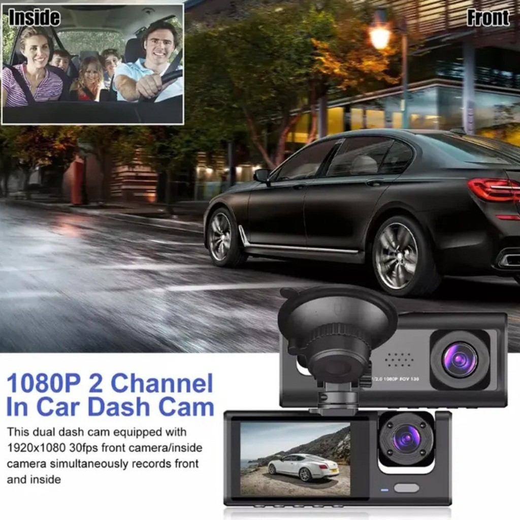 Câmera de segurança automotiva com **três lentes simultâneas** para gravação em tempo real da parte frontal, interior e traseira do veículo. Ideal para proteção completa em 360 graus. **Principais recursos:** * Gravação simultânea: câmera frontal (170°), câmera interna (120°) e câmera traseira (120°). * Instalação discreta: design compacto, pode ser instalada atrás do retrovisor sem atrapalhar a visão. * Gravação em loop contínuo: substitui vídeos antigos automaticamente quando o cartão estiver cheio. * Sensor G (gravitacional): em caso de colisão, o vídeo é bloqueado automaticamente para preservar a prova. * Detecção de movimento: ativa a gravação quando detecta movimento próximo ao veículo, mesmo estacionado. * Monitoramento com 3 câmeras mesmo com o carro desligado, em caso de impacto. **Especificações Técnicas:** * Tela: 2 polegadas * Resolução: 1080P (frontal), VGA (internas) * Formato de vídeo: AVI * Interface: USB * Alimentação: 5V / 1A * Suporta cartão TF até 128GB(não incluso) * Cor: Preto * Material: ABS * Gravação em loop e sincronização automática com a ignição **Conteúdo da embalagem:** * 1x Gravador veicular (DVR) * 1x Câmera traseira (22x22mm, com cabo de 6m) * 1x Carregador veicular * 1x Cabo de alimentação (3,5m)